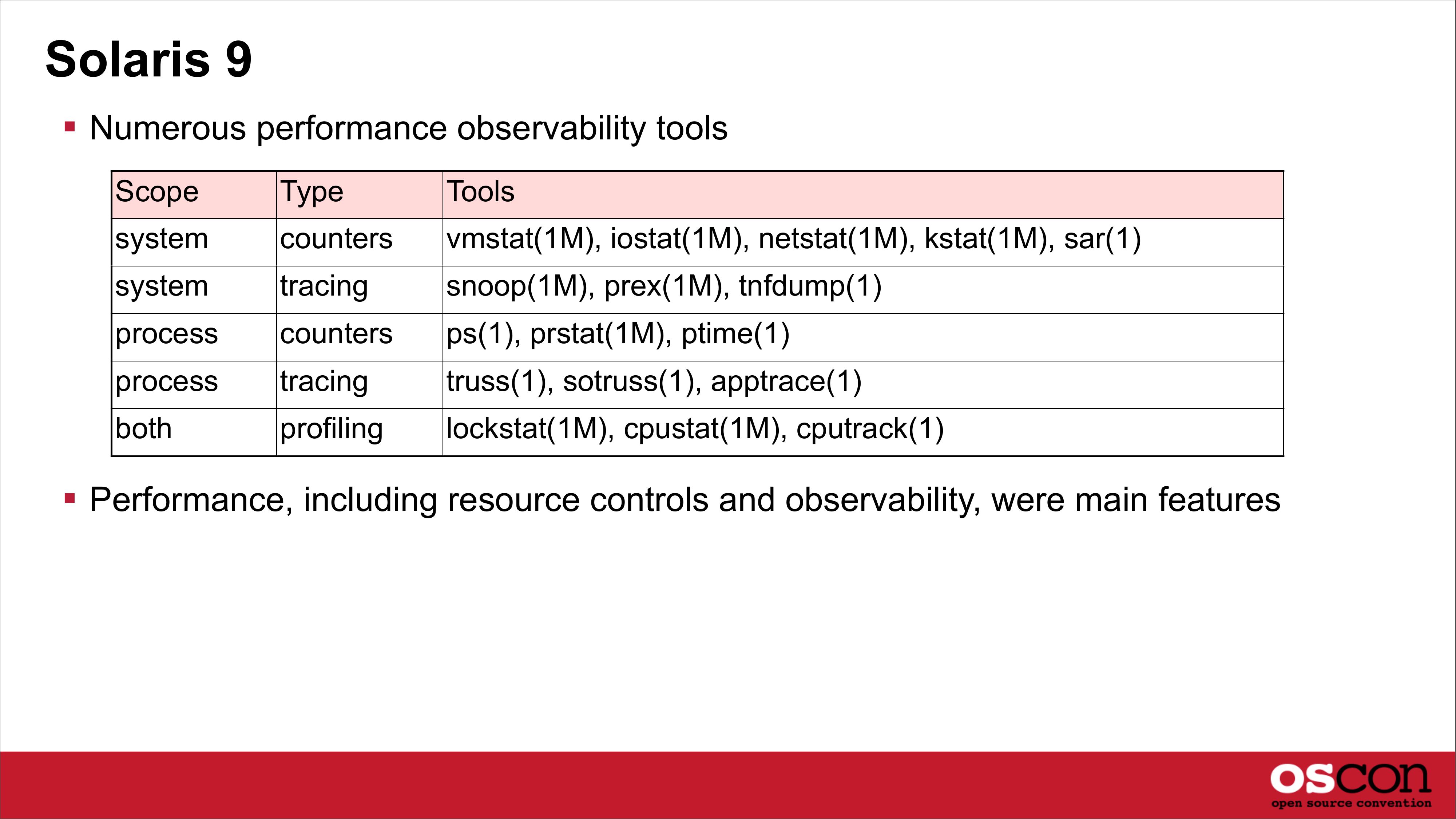 Solaris 9 Numerous performance observability tools Scope Type Tools system counters vmstat(1M), iostat(1M), netstat(1M), kstat(1M), sar(1) system tracing snoop(1M), prex(1M), tnfdump(1) process counters ps(1), prstat(1M), ptime(1) process tracing truss(1), sotruss(1), apptrace(1) both profiling lockstat(1M), cpustat(1M), cputrack(1) Performance, including resource controls and observability, were main featuresslide 8: