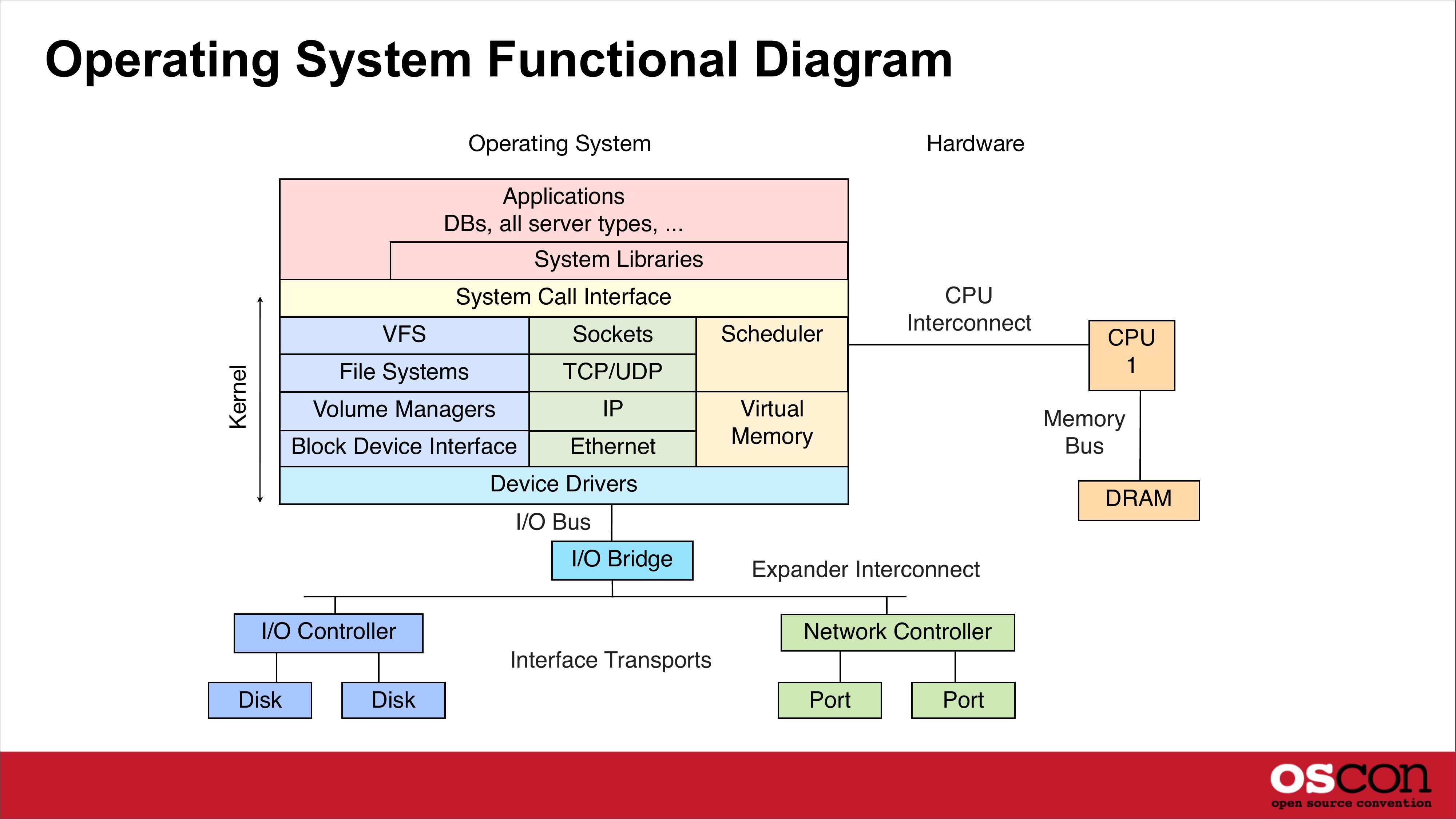 Operating System Functional Diagram Operating System Hardware Applications DBs, all server types, ... System Libraries Kernel System Call Interface VFS Sockets File Systems TCP/UDP Volume Managers Block Device Interface Ethernet Scheduler CPU Interconnect Virtual Memory Memory Bus Device Drivers DRAM I/O Bus I/O Bridge I/O Controller Expander Interconnect Network Controller Interface Transports Disk Disk CPU Port Portslide 10: