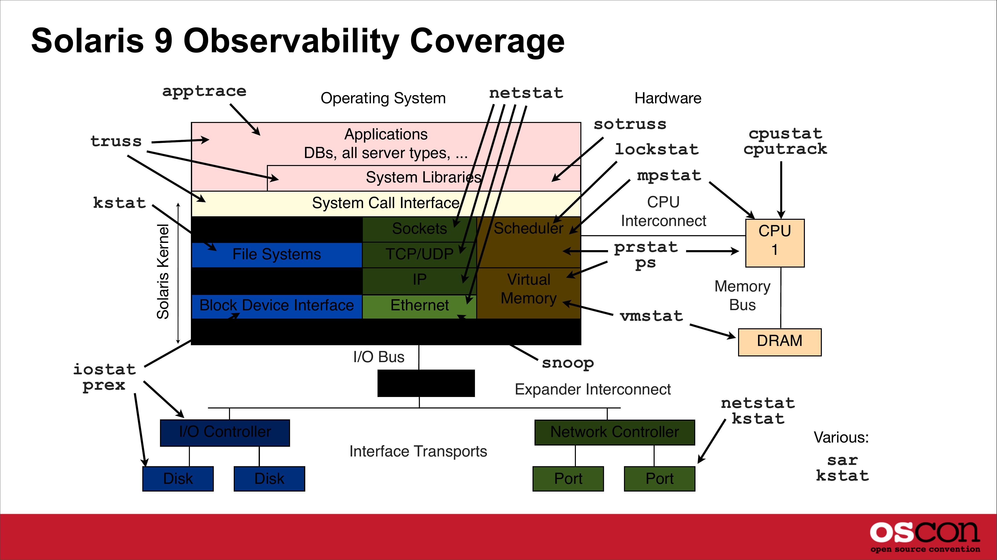 Solaris 9 Observability Coverage apptrace Operating System netstat sotruss lockstat mpstat Applications DBs, all server types, ... truss System Libraries kstat Hardware Solaris Kernel System Call Interface VFS Sockets File Systems TCP/UDP Volume Managers Block Device Interface Ethernet Scheduler prstat Virtual Memory Device Drivers I/O Bus iostat prex I/O Bridge I/O Controller CPU Interconnect vmstat Disk CPU Memory Bus DRAM snoop Expander Interconnect Network Controller Interface Transports Disk cpustat cputrack Port Port netstat kstat Various: sar kstatslide 11: