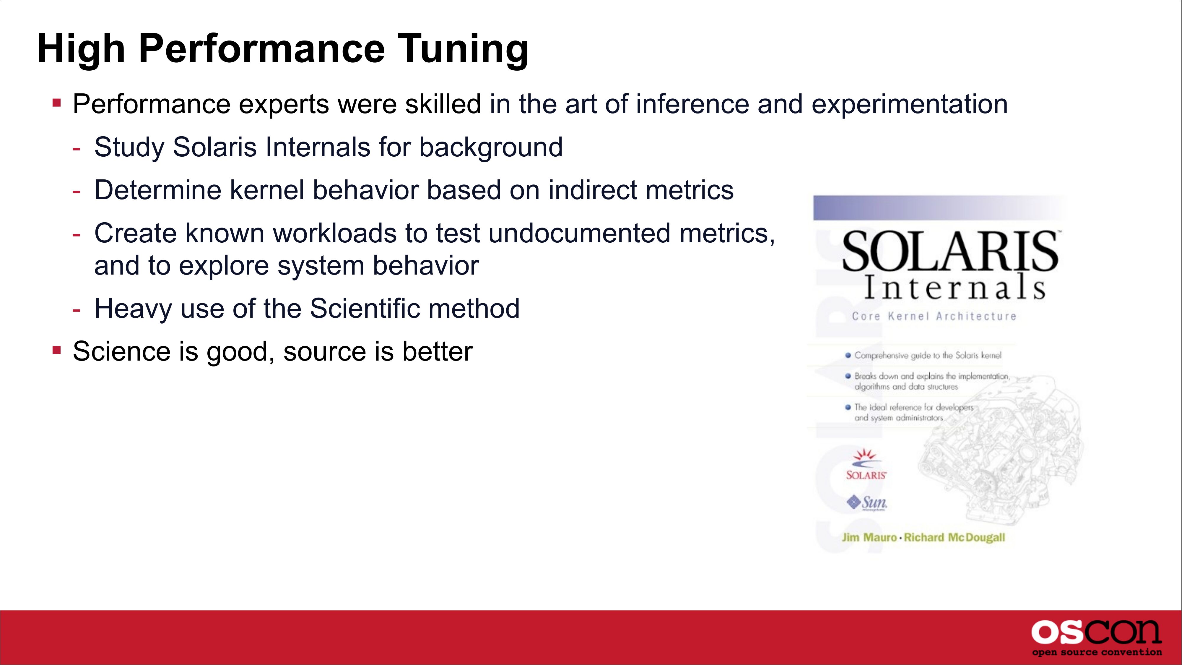 High Performance Tuning Performance experts were skilled in the art of inference and experimentation - Study Solaris Internals for background - Determine kernel behavior based on indirect metrics - Create known workloads to test undocumented metrics, and to explore system behavior - Heavy use of the Scientific method Science is good, source is betterslide 13: