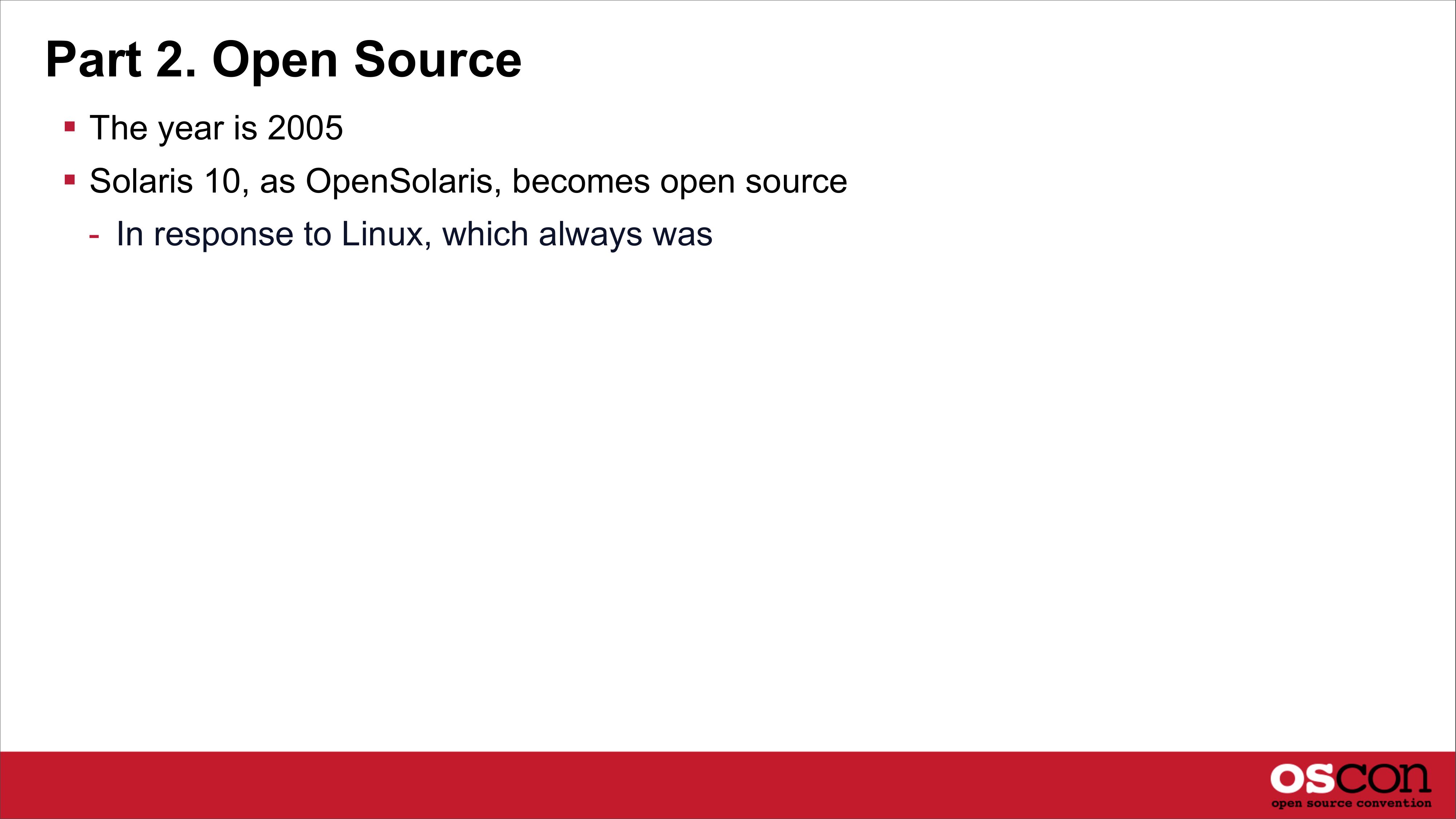 Part 2. Open Source The year is 2005 Solaris 10, as OpenSolaris, becomes open source - In response to Linux, which always wasslide 16: