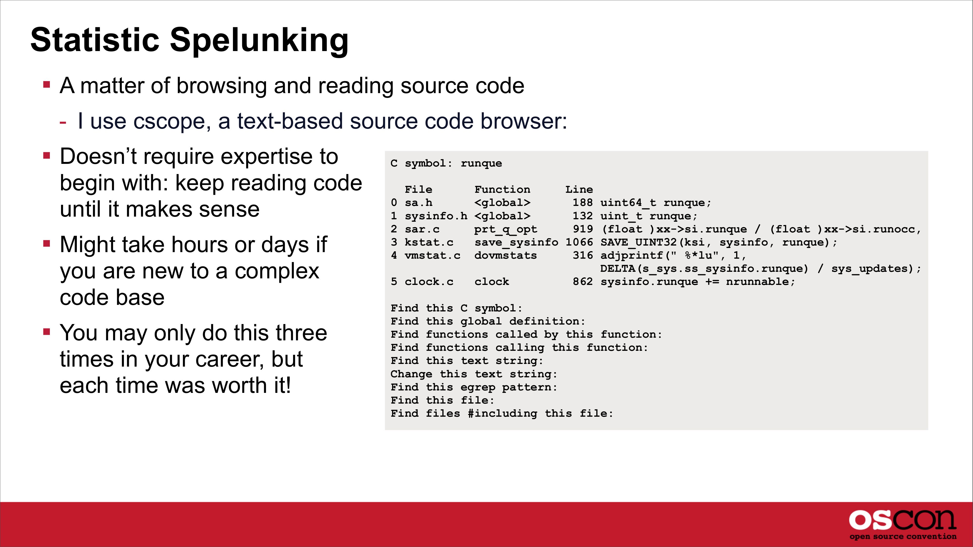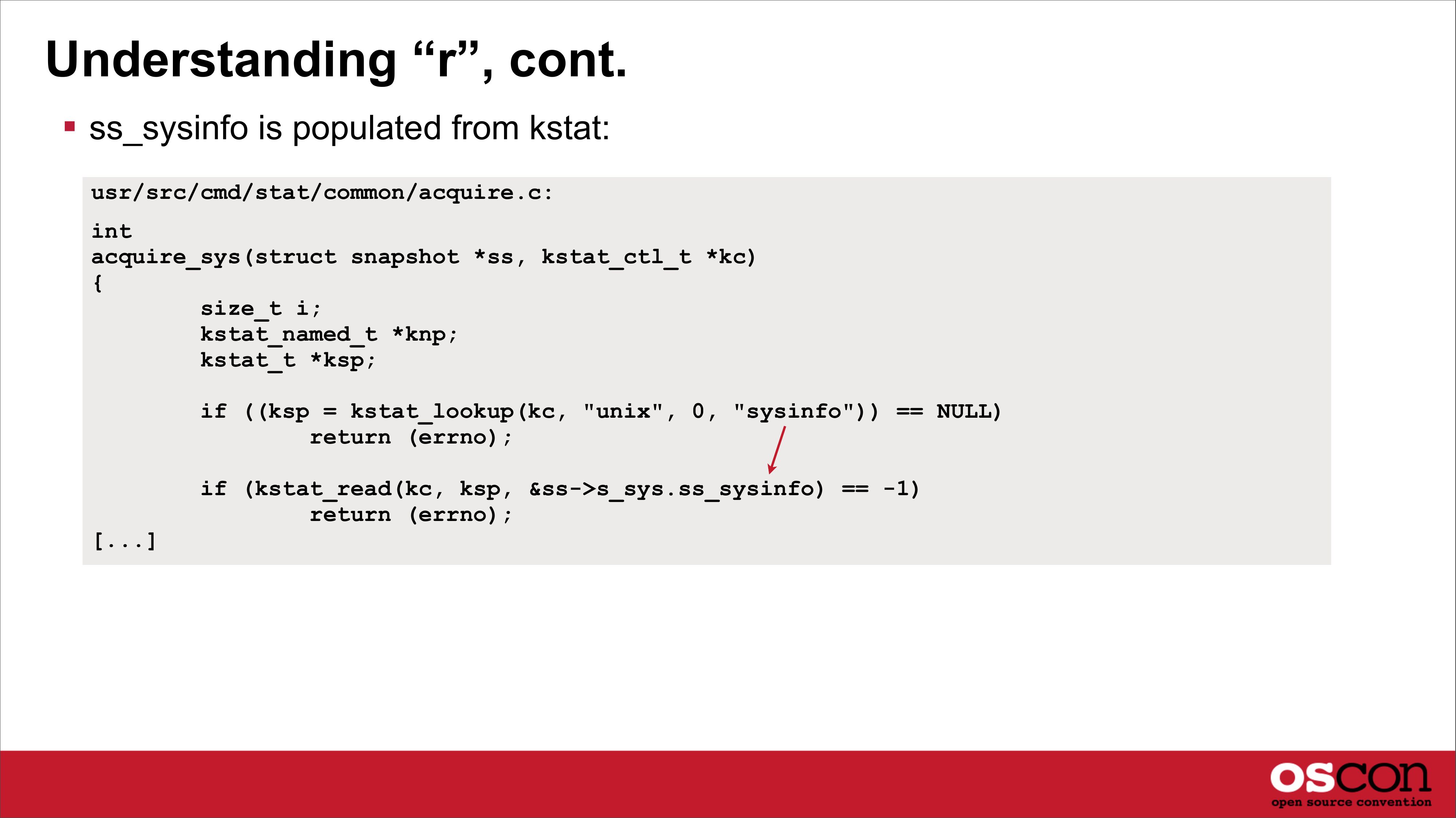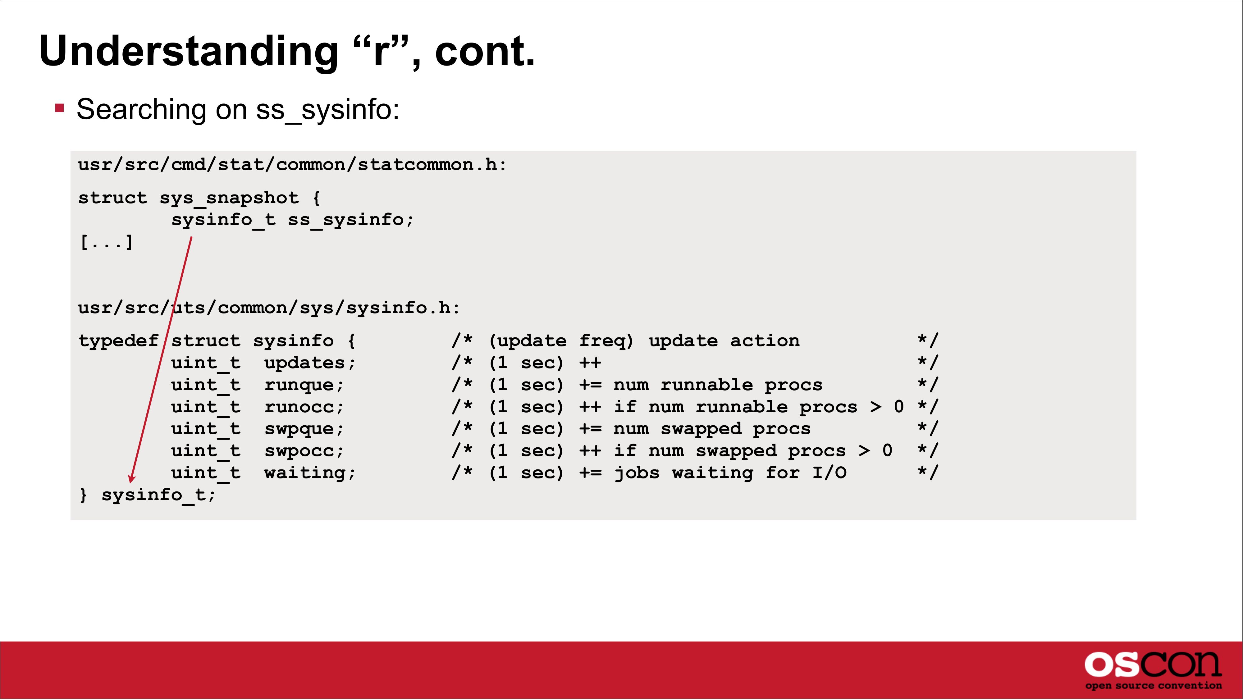 Open Source Metrics Undocumented kstats could now be understood from source - it was like being handed the source code to the Universe - I wasn’t a Sun badged employee; I’d been working without source access Tool metrics could also be better understood, and exact behavior of the kernel $ vmstat 1 kthr memory r b w swap free re 0 0 0 8475356 565176 2 1 0 0 7983772 119164 0 page disk faults cpu mf pi po fr de sr cd cd s0 s5 cs us sy id 8 0 0 0 0 1 0 0 -0 13 378 101 142 0 0 99 0 0 0 0 0 0 224 0 0 0 1175 5654 1196 1 15 84 For example, where does “r” come from?slide 17: