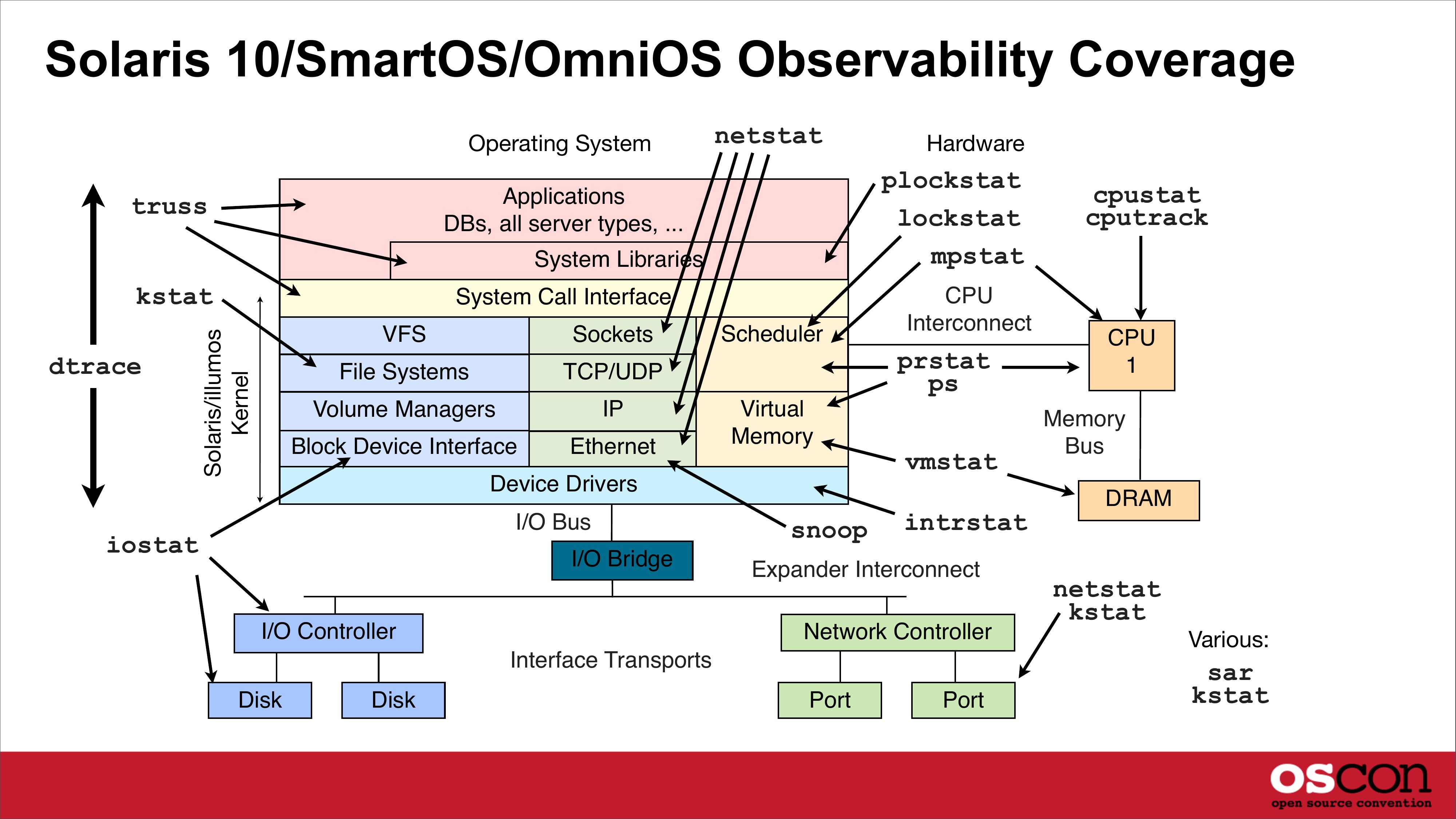 Solaris 10/SmartOS/OmniOS Observability Coverage Operating System netstat plockstat lockstat mpstat Applications DBs, all server types, ... truss System Libraries kstat Solaris/illumos Kernel dtrace System Call Interface VFS Sockets File Systems TCP/UDP Volume Managers Block Device Interface Ethernet Scheduler iostat I/O Bridge I/O Controller CPU Interconnect prstat Virtual Memory Device Drivers I/O Bus Hardware snoop vmstat intrstat Expander Interconnect Network Controller Interface Transports Disk Disk Port Port cpustat cputrack CPU Memory Bus DRAM netstat kstat Various: sar kstatslide 24: