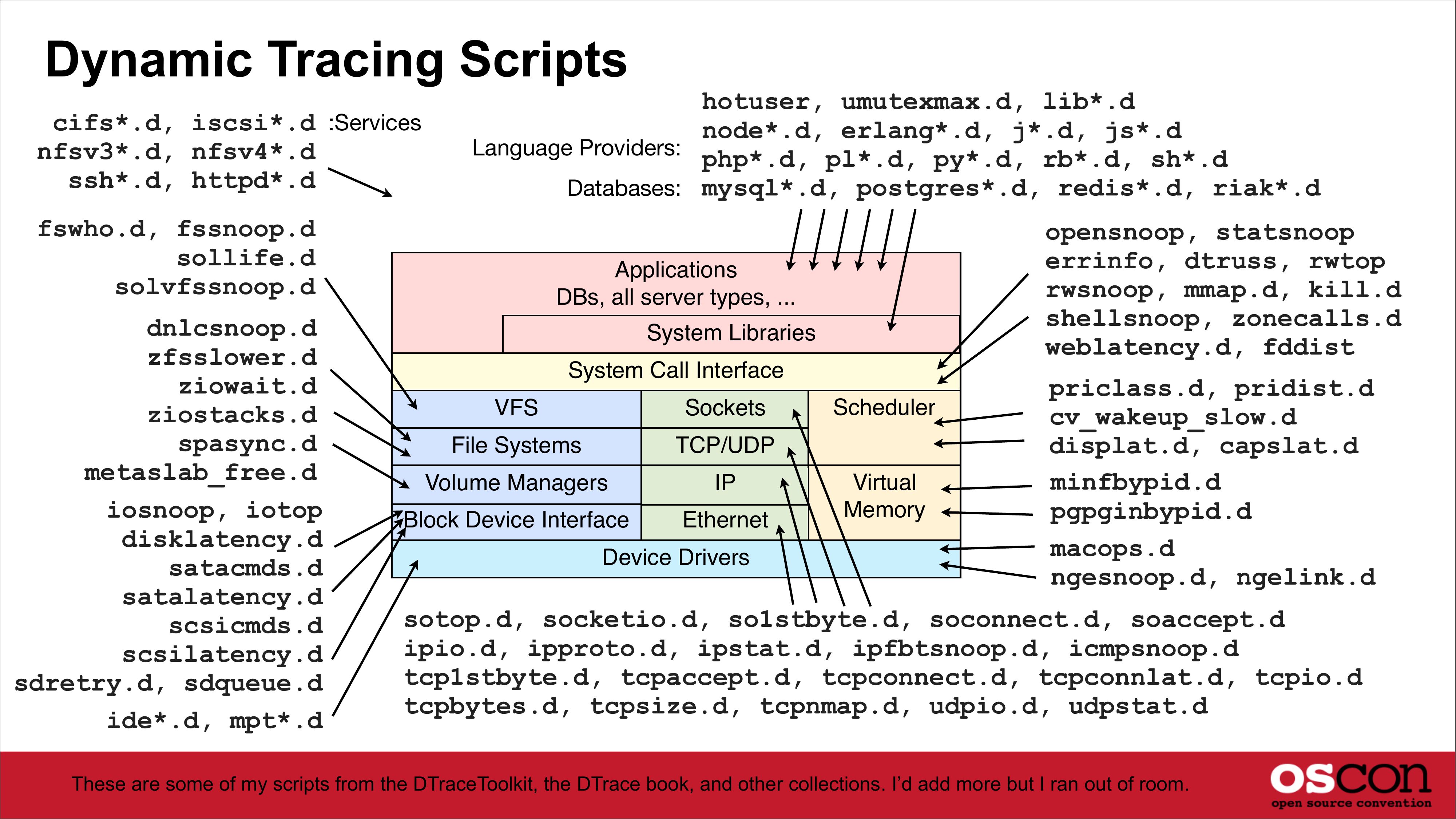 slide 25:Dynamic Tracing Scripts cifs*.d, iscsi*.d :Services nfsv3*.d, nfsv4*.d ssh*.d, httpd*.d hotuser, umutexmax.d, lib*.d node*.d, erlang*.d, j*.d, js*.d Language Providers: php*.d, pl*.d, py*.d, rb*.d, sh*.d Databases: mysql*.d, postgres*.d, redis*.d, riak*.d fswho.d, fssnoop.d sollife.d solvfssnoop.d dnlcsnoop.d zfsslower.d ziowait.d ziostacks.d spasync.d metaslab_free.d iosnoop, iotop disklatency.d satacmds.d satalatency.d scsicmds.d scsilatency.d sdretry.d, sdqueue.d ide*.d, mpt*.d opensnoop, statsnoop errinfo, dtruss, rwtop rwsnoop, mmap.d, kill.d shellsnoop, zonecalls.d weblatency.d, fddist Applications DBs, all server types, ... System Libraries System Call Interface VFS Sockets File Systems TCP/UDP Volume Managers Block Device Interface Ethernet Device Drivers Scheduler Virtual Memory priclass.d, pridist.d cv_wakeup_slow.d displat.d, capslat.d minfbypid.d pgpginbypid.d macops.d ngesnoop.d, ngelink.d sotop.d, socketio.d, so1stbyte.d, soconnect.d, soaccept.d ipio.d, ipproto.d, ipstat.d, ipfbtsnoop.d, icmpsnoop.d tcp1stbyte.d, tcpaccept.d, tcpconnect.d, tcpconnlat.d, tcpio.d tcpbytes.d, tcpsize.d, tcpnmap.d, udpio.d, udpstat.d These are some of my scripts from the DTraceToolkit, the DTrace book, and other collections. I’d add more but I ran out of room.slide 26: