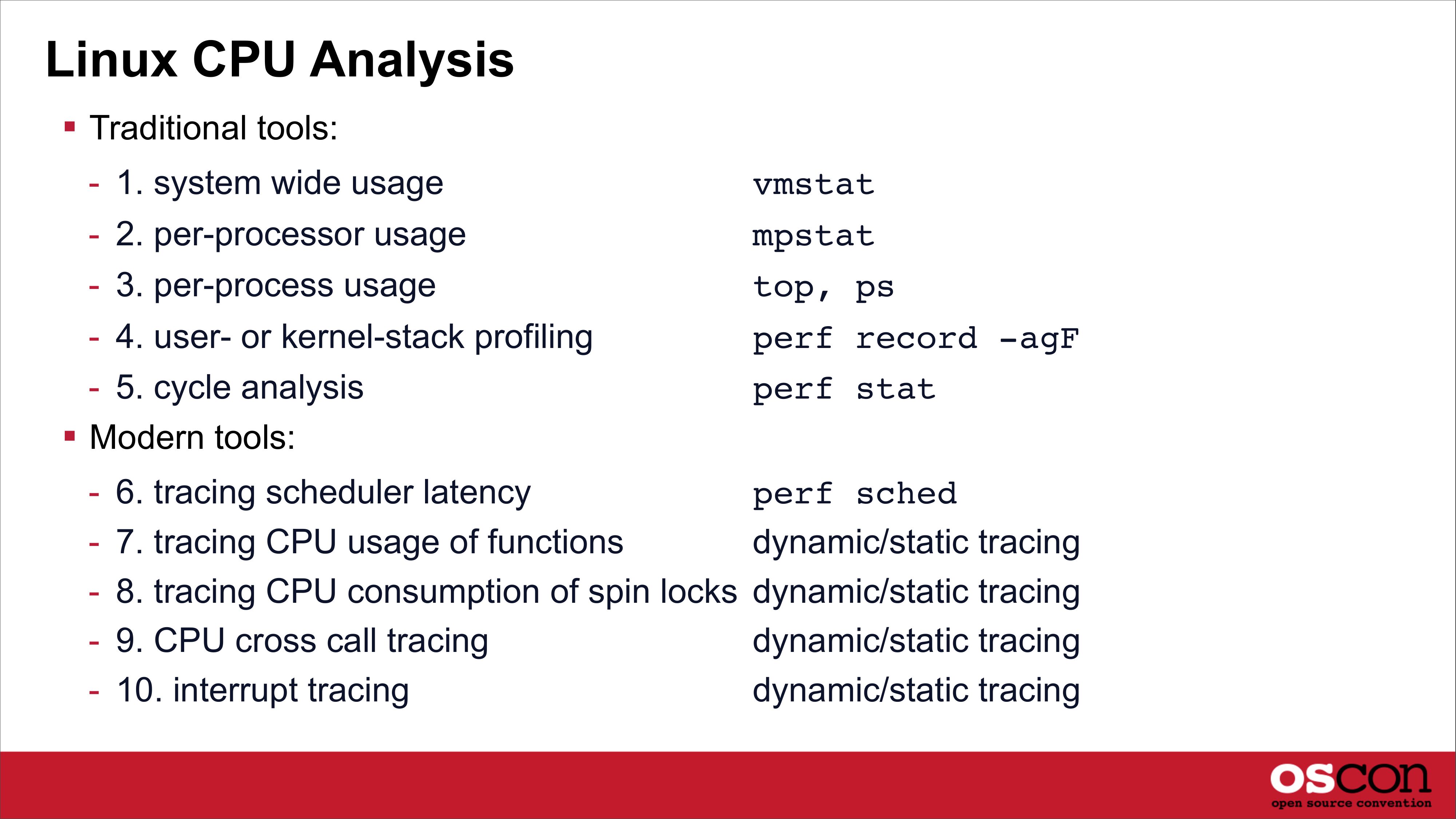 Linux CPU Analysis Traditional tools: - 1. system wide usage vmstat - 2. per-processor usage - 3. per-process usage mpstat top, ps - 4. user- or kernel-stack profiling - 5. cycle analysis Modern tools: perf record -agF perf stat perf sched - 6. tracing scheduler latency - 7. tracing CPU usage of functions dynamic/static tracing - 8. tracing CPU consumption of spin locks dynamic/static tracing - 9. CPU cross call tracing dynamic/static tracing - 10. interrupt tracing dynamic/static tracingslide 28: