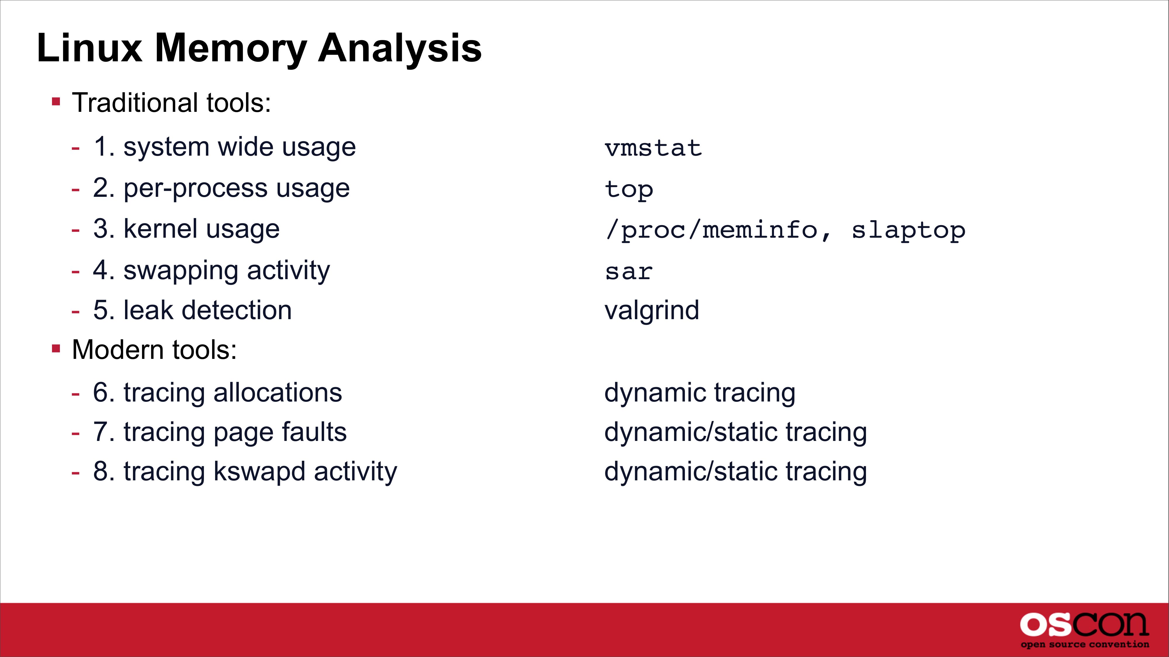 Linux Memory Analysis Traditional tools: - 1. system wide usage vmstat - 2. per-process usage - 3. kernel usage top /proc/meminfo, slaptop - 4. swapping activity - 5. leak detection Modern tools: - 6. tracing allocations - 7. tracing page faults - 8. tracing kswapd activity sar valgrind dynamic tracing dynamic/static tracing dynamic/static tracingslide 29: