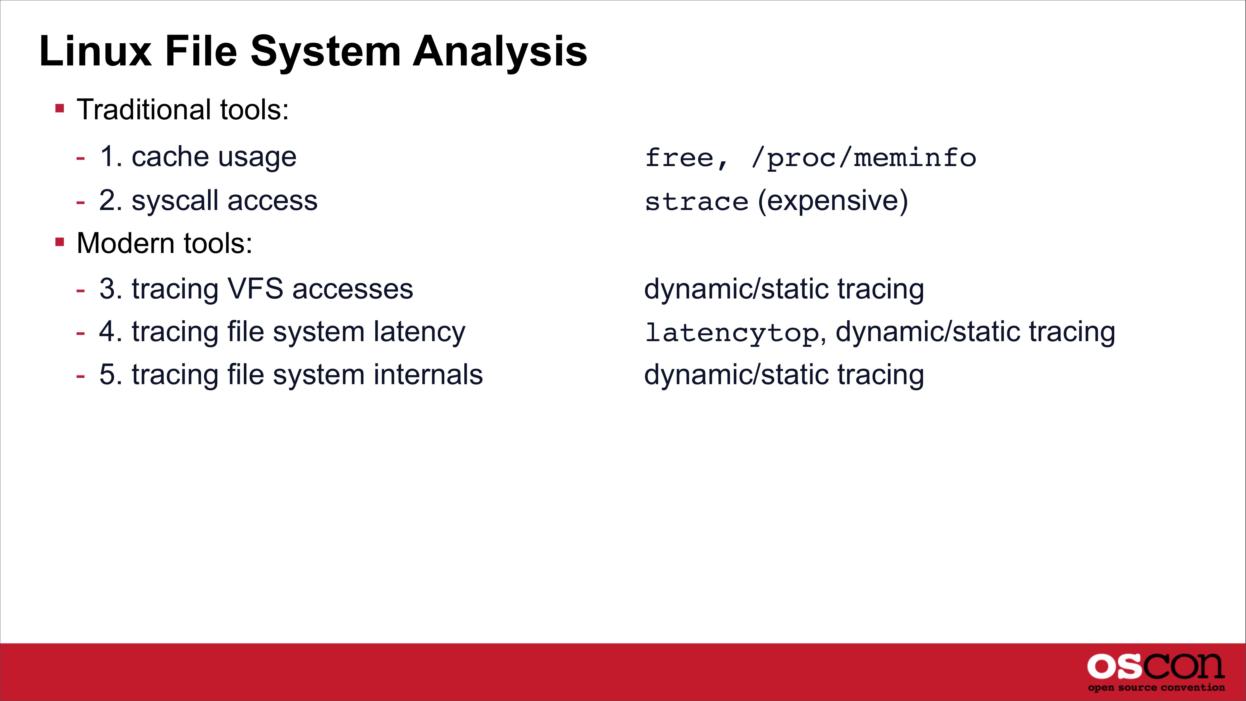 Linux File System Analysis Traditional tools: - 1. cache usage - 2. syscall access Modern tools: - 3. tracing VFS accesses - 4. tracing file system latency - 5. tracing file system internals free, /proc/meminfo strace (expensive) dynamic/static tracing latencytop, dynamic/static tracing dynamic/static tracingslide 30: