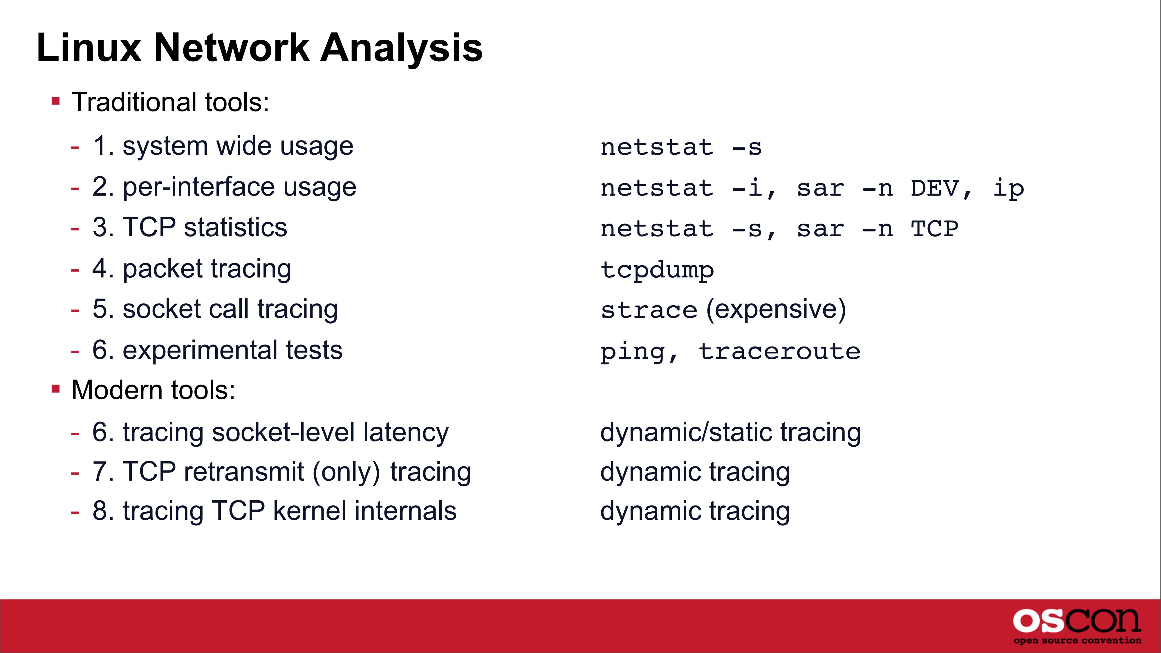 Linux Network Analysis Traditional tools: - 1. system wide usage netstat -s - 2. per-interface usage - 3. TCP statistics netstat -i, sar -n DEV, ip netstat -s, sar -n TCP - 4. packet tracing - 5. socket call tracing tcpdump strace (expensive) - 6. experimental tests Modern tools: ping, traceroute - 6. tracing socket-level latency - 7. TCP retransmit (only) tracing - 8. tracing TCP kernel internals dynamic/static tracing dynamic tracing dynamic tracingslide 32: