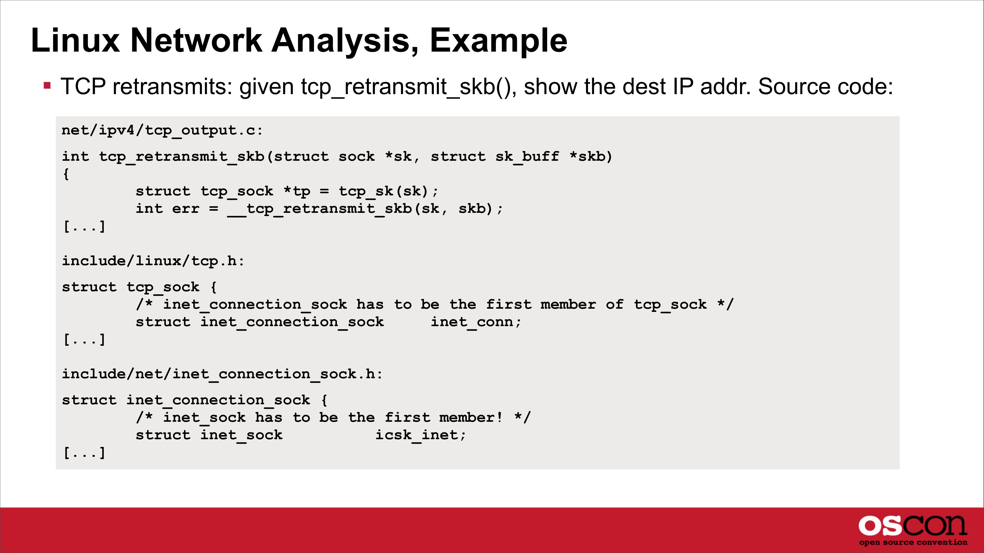slide 35:Linux Network Analysis, Example Output TCP retransmit tracing script, using DTrace4Linux (prototype): # ./tcpretransmit.d Tracing TCP retransmits... Ctrl-C to end. 2013 Feb 23 18:24:11: retransmit to 10.2.124.2, by: kernel`tcp_retransmit_timer+0x1bd kernel`tcp_write_timer+0x188 kernel`run_timer_softirq+0x12b kernel`tcp_write_timer kernel`__do_softirq+0xb8 kernel`read_tsc+0x9 kernel`sched_clock+0x9 kernel`sched_clock_local+0x25 kernel`call_softirq+0x1c kernel`do_softirq+0x65 kernel`irq_exit+0x9e kernel`smp_apic_timer_interrupt+0x6e kernel`apic_timer_interrupt+0x6e [...]slide 36: