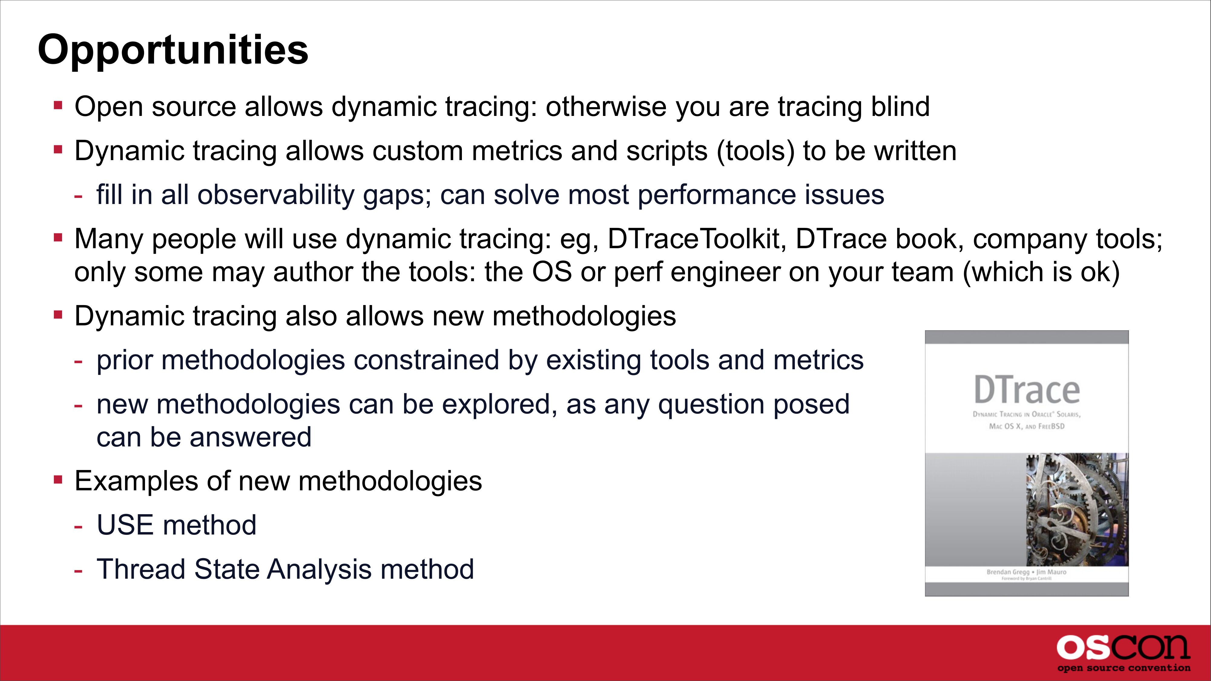 Opportunities Open source allows dynamic tracing: otherwise you are tracing blind Dynamic tracing allows custom metrics and scripts (tools) to be written - fill in all observability gaps; can solve most performance issues Many people will use dynamic tracing: eg, DTraceToolkit, DTrace book, company tools; only some may author the tools: the OS or perf engineer on your team (which is ok) Dynamic tracing also allows new methodologies - prior methodologies constrained by existing tools and metrics - new methodologies can be explored, as any question posed can be answered Examples of new methodologies - USE method - Thread State Analysis methodslide 38: