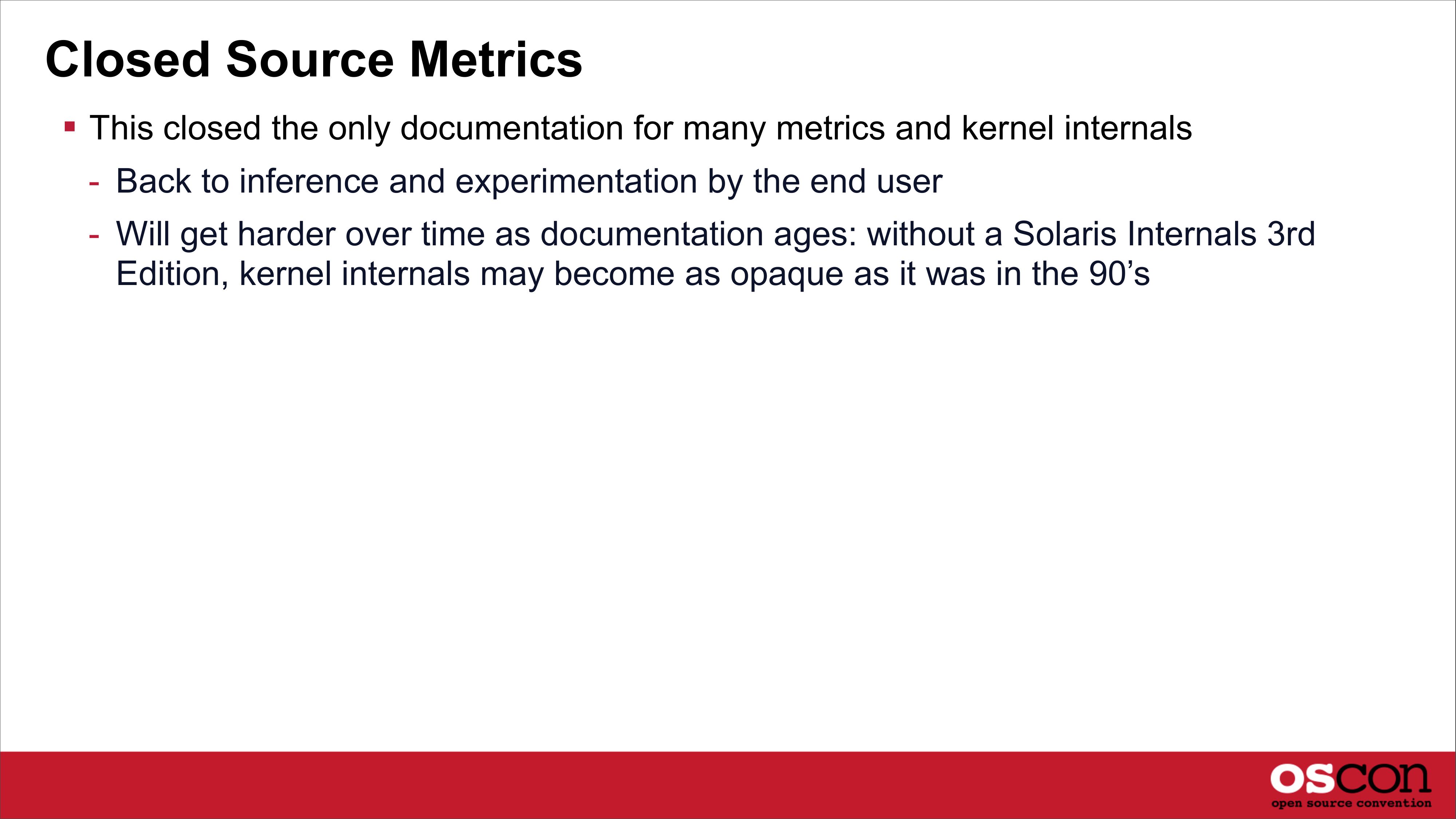 Closed Source Metrics This closed the only documentation for many metrics and kernel internals - Back to inference and experimentation by the end user - Will get harder over time as documentation ages: without a Solaris Internals 3rd Edition, kernel internals may become as opaque as it was in the 90’sslide 42: