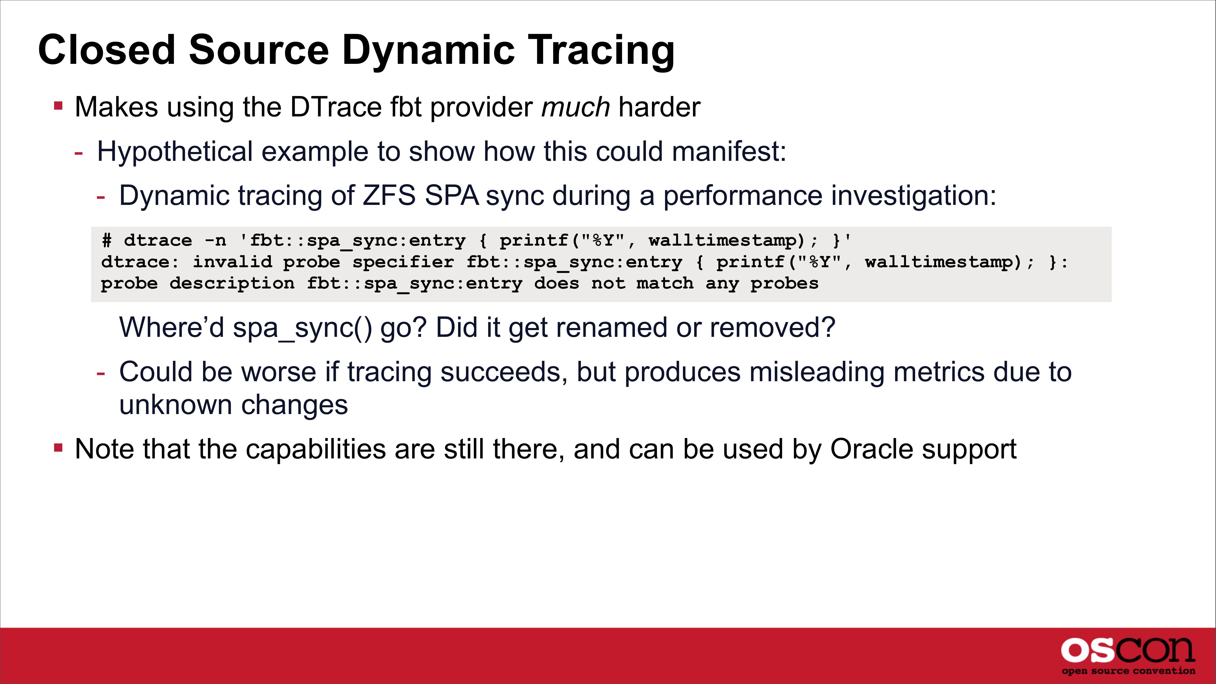 slide 43:Elsewhere at Oracle Their DTrace port for Oracle Linux won’t have this handicap - although, the fbt provider hasn’t been included yetslide 44: