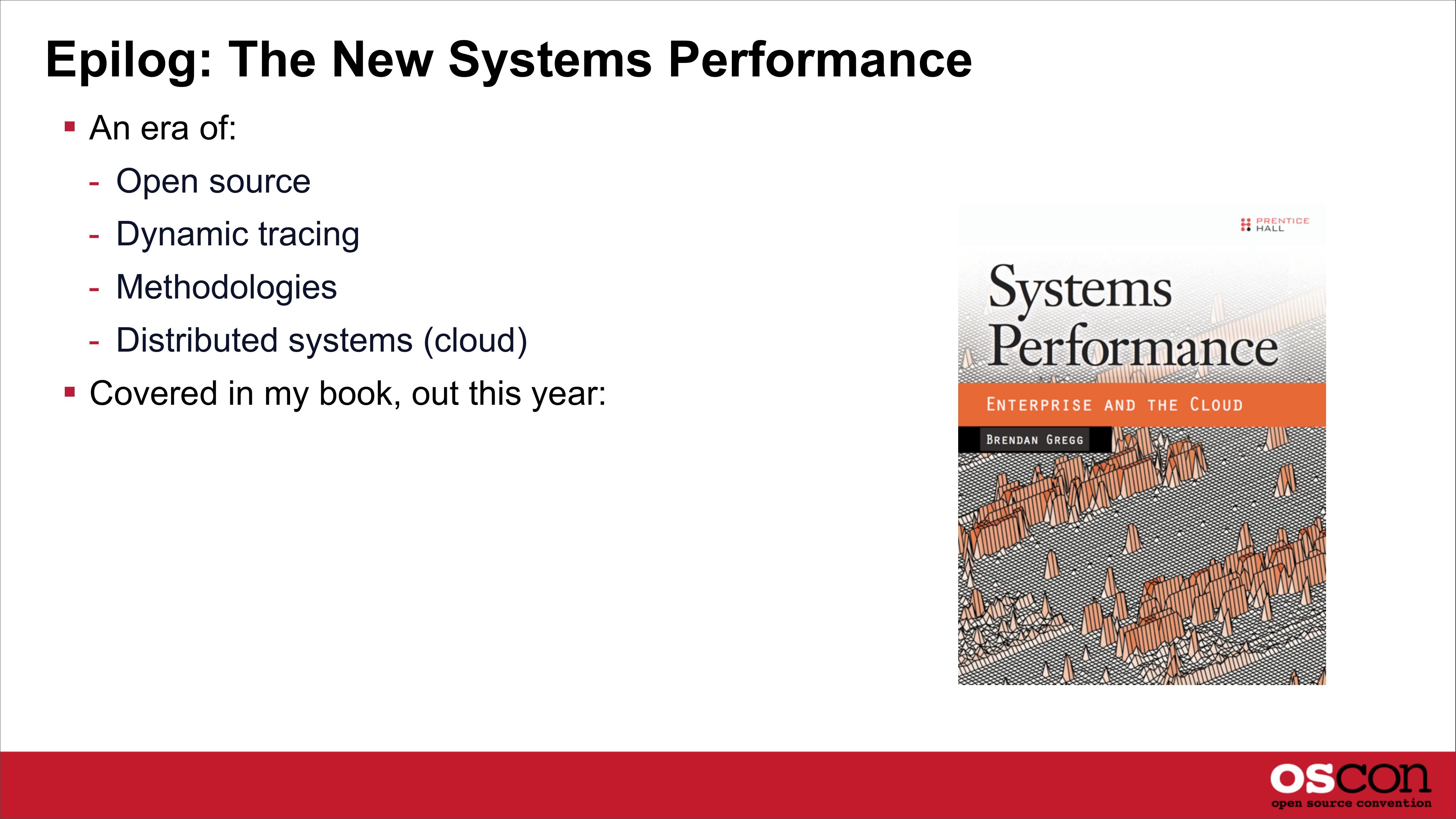 Epilog: The New Systems Performance An era of: - Open source - Dynamic tracing - Methodologies - Distributed systems (cloud) Covered in my book, out this year:slide 45: