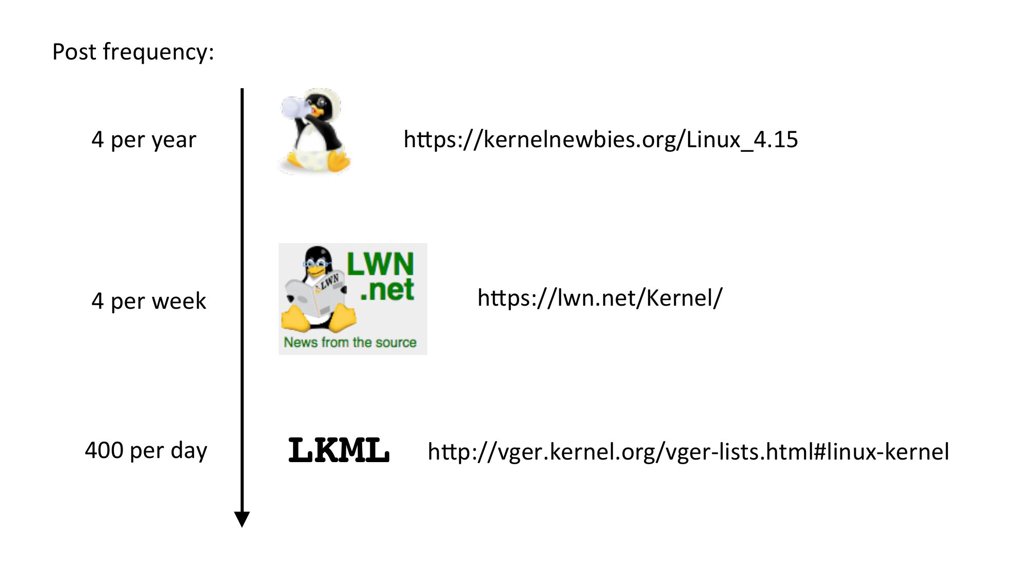 Post frequency: 4 per year h1ps://kernelnewbies.org/Linux_4.15 4 per week h1ps://lwn.net/Kernel/ 400 per day LKML h1p://vger.kernel.org/vger-lists.html#linux-kernelslide 4:
