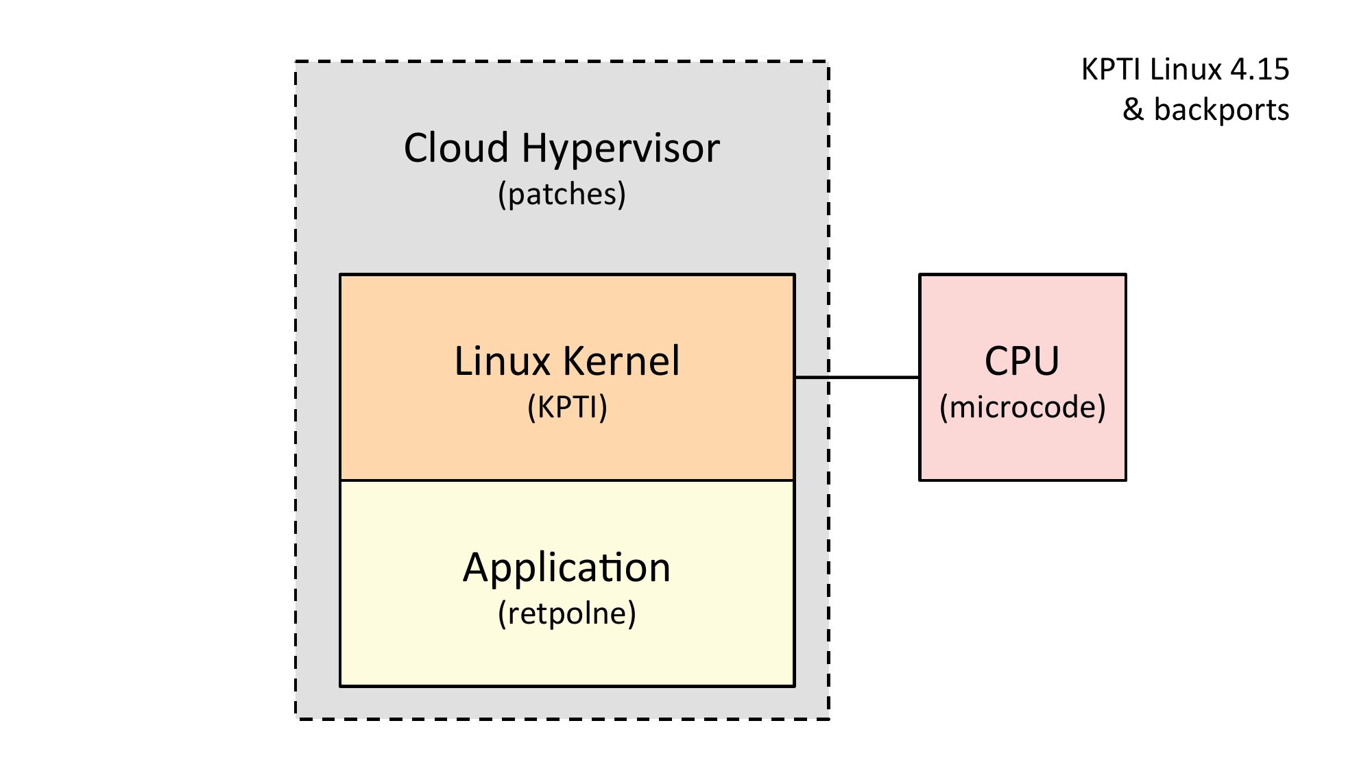 KPTI Linux 4.15 & backports Cloud Hypervisor (patches) Linux Kernel (KPTI) ApplicaUon (retpolne) CPU (microcode)slide 6:
