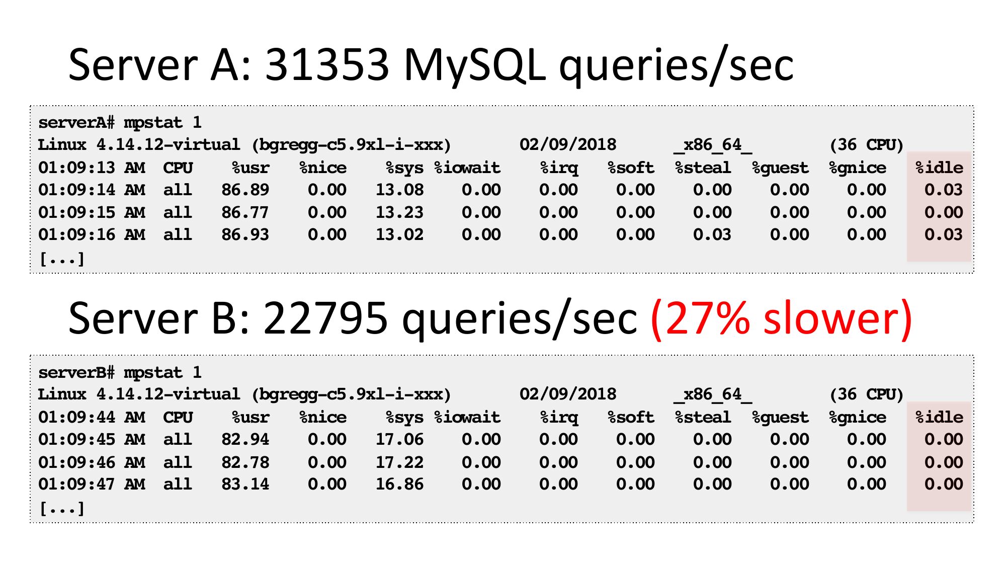 Server A: 31353 MySQL queries/sec serverA# mpstat 1 Linux 4.14.12-virtual (bgregg-c5.9xl-i-xxx) 02/09/2018 _x86_64_ (36 CPU) 01:09:13 AM CPU %usr %nice %sys %iowait %irq %soft %steal %guest %gnice %idle 01:09:14 AM all 86.89 0.00 13.08 01:09:15 AM all 86.77 0.00 13.23 01:09:16 AM all 86.93 0.00 13.02 [...] Server B: 22795 queries/sec (27% slower) serverB# mpstat 1 Linux 4.14.12-virtual (bgregg-c5.9xl-i-xxx) 02/09/2018 _x86_64_ (36 CPU) 01:09:44 AM CPU %usr %nice %sys %iowait %irq %soft %steal %guest %gnice %idle 01:09:45 AM all 82.94 0.00 17.06 01:09:46 AM all 82.78 0.00 17.22 01:09:47 AM all 83.14 0.00 16.86 [...]slide 7: