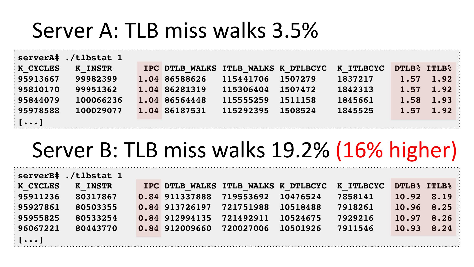 Server A: TLB miss walks 3.5% serverA# ./tlbstat 1 K_CYCLES K_INSTR [...] IPC DTLB_WALKS ITLB_WALKS K_DTLBCYC 1.04 86588626 115441706 1507279 1.04 86281319 115306404 1507472 1.04 86564448 115555259 1511158 1.04 86187531 115292395 1508524 K_ITLBCYC DTLB% ITLB% 1.57 1.92 1.57 1.92 1.58 1.93 1.57 1.92 Server B: TLB miss walks 19.2% (16% higher) serverB# ./tlbstat 1 K_CYCLES K_INSTR [...] IPC DTLB_WALKS ITLB_WALKS K_DTLBCYC 0.84 911337888 719553692 10476524 0.84 913726197 721751988 10518488 0.84 912994135 721492911 10524675 0.84 912009660 720027006 10501926 K_ITLBCYC DTLB% ITLB% 10.92 8.19 10.96 8.25 10.97 8.26 10.93 8.24slide 9: