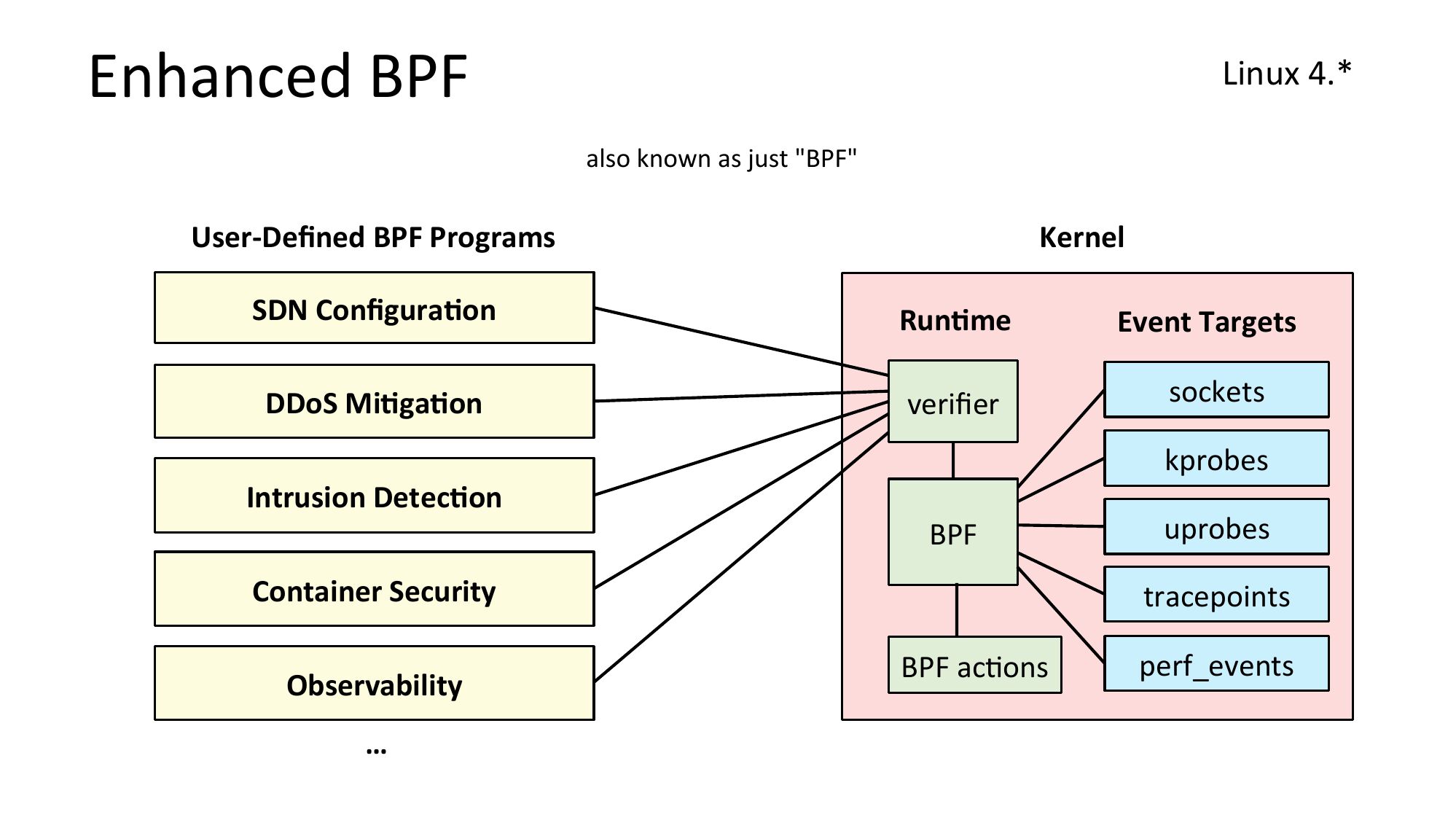 Enhanced BPF Linux 4.* also known as just "BPF" User-Defined BPF Programs Kernel SDN Configura:on Run:me Event Targets DDoS Mi:ga:on verifier sockets Intrusion Detec:on kprobes BPF Container Security Observability uprobes tracepoints BPF acUons perf_eventsslide 11: