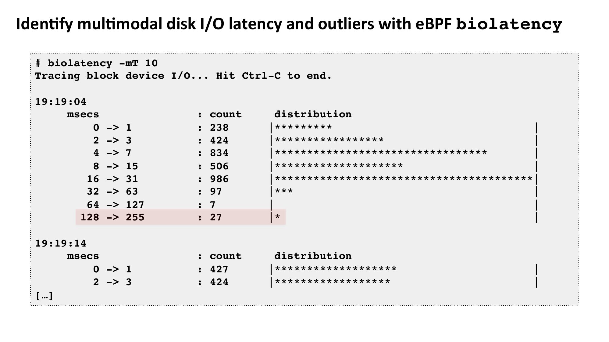 Iden:fy mul:modal disk I/O latency and outliers with eBPF biolatency # biolatency -mT 10 Tracing block device I/O... Hit Ctrl-C to end. 19:19:04 msecs 0 ->gt; 1 2 ->gt; 3 4 ->gt; 7 8 ->gt; 15 16 ->gt; 31 32 ->gt; 63 64 ->gt; 127 128 ->gt; 255 19:19:14 msecs 0 ->gt; 1 2 ->gt; 3 […] : count : 238 : 424 : 834 : 506 : 986 : 97 : 7 : 27 distribution |********* |***************** |********************************* |******************** |****************************************| |*** : count : 427 : 424 distribution |******************* |******************slide 13: