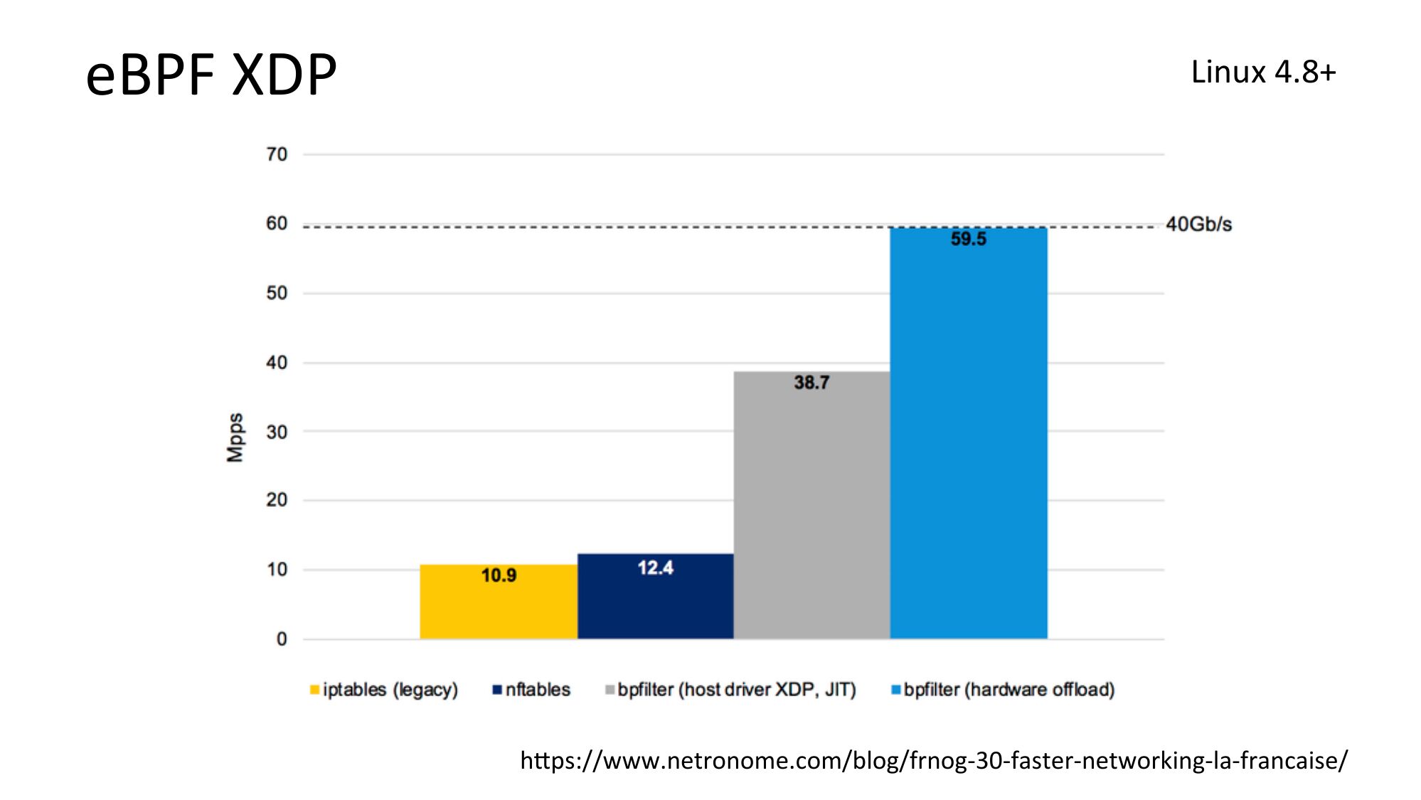 eBPF XDP Linux 4.8+ h1ps://www.netronome.com/blog/frnog-30-faster-networking-la-francaise/slide 15: