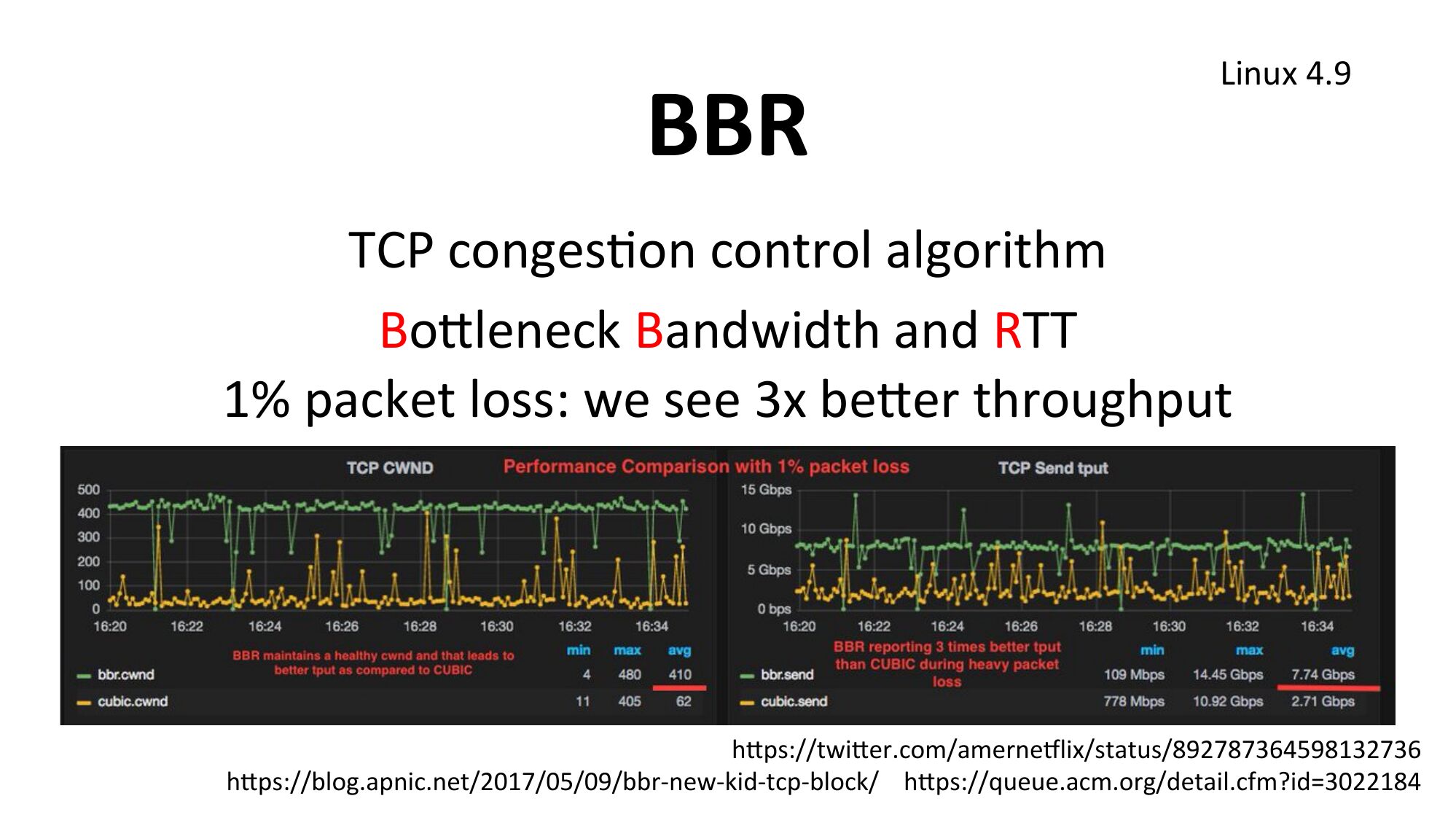 BBR Linux 4.9 TCP congesUon control algorithm Bo1leneck Bandwidth and RTT 1% packet loss: we see 3x be1er throughput h1ps://twi1er.com/amerneklix/status/892787364598132736 h1ps://blog.apnic.net/2017/05/09/bbr-new-kid-tcp-block/ h1ps://queue.acm.org/detail.cfm?id=3022184slide 16: