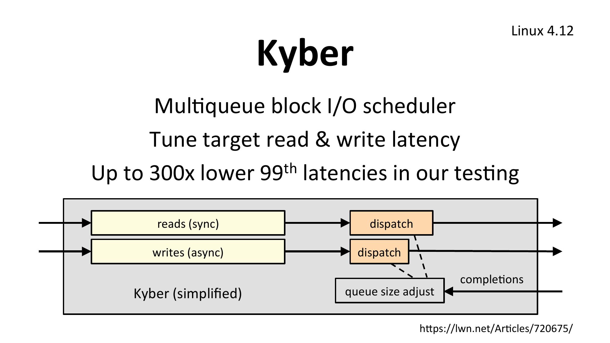 Linux 4.12 Kyber MulUqueue block I/O scheduler Tune target read & write latency Up to 300x lower 99th latencies in our tesUng reads (sync) writes (async) Kyber (simplified) dispatch dispatch queue size adjust compleUons h1ps://lwn.net/ArUcles/720675/slide 17: