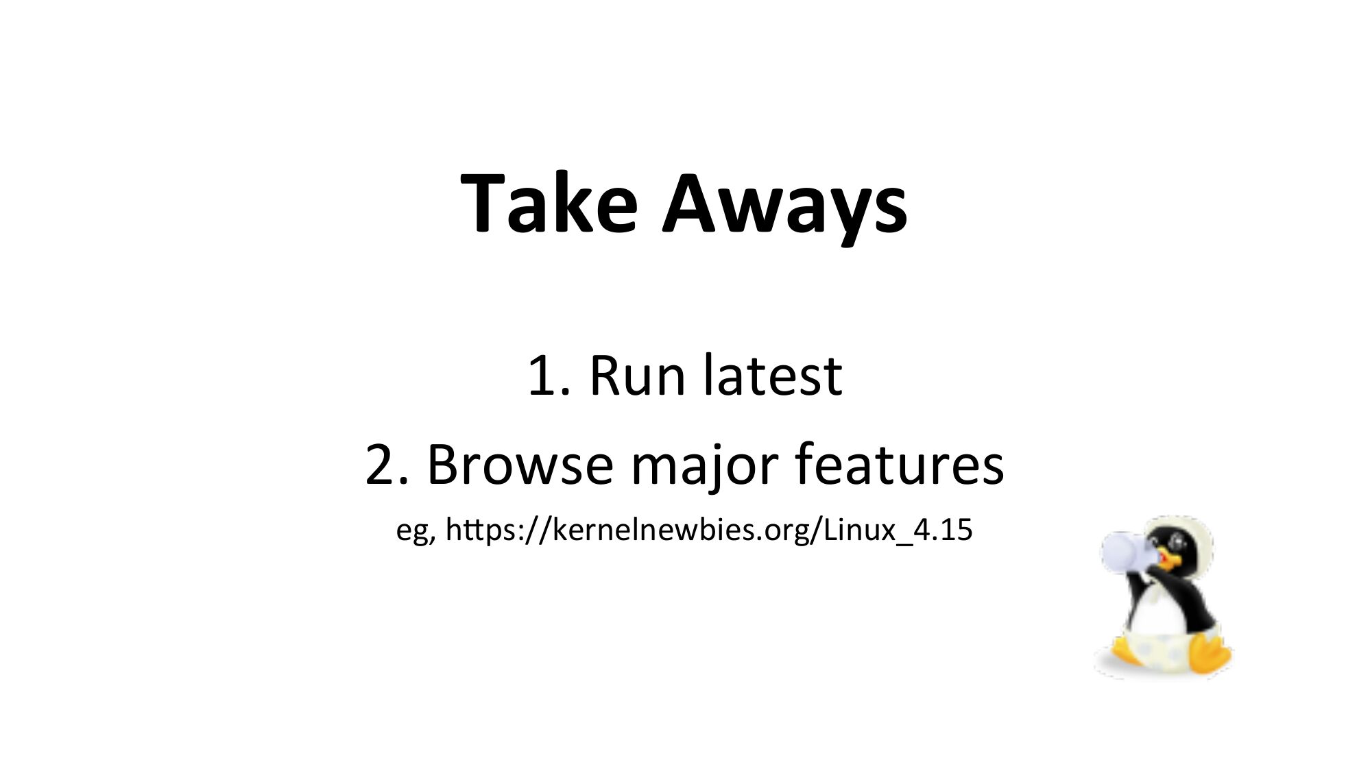 Take Aways 1. Run latest 2. Browse major features eg, h1ps://kernelnewbies.org/Linux_4.15slide 19:
