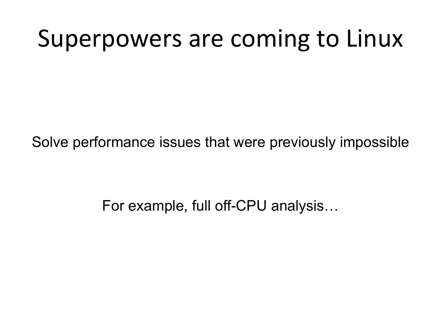 Superpowers are coming to Linux Solve performance issues that were previously impossible For example, full off-CPU analysis…slide 5: