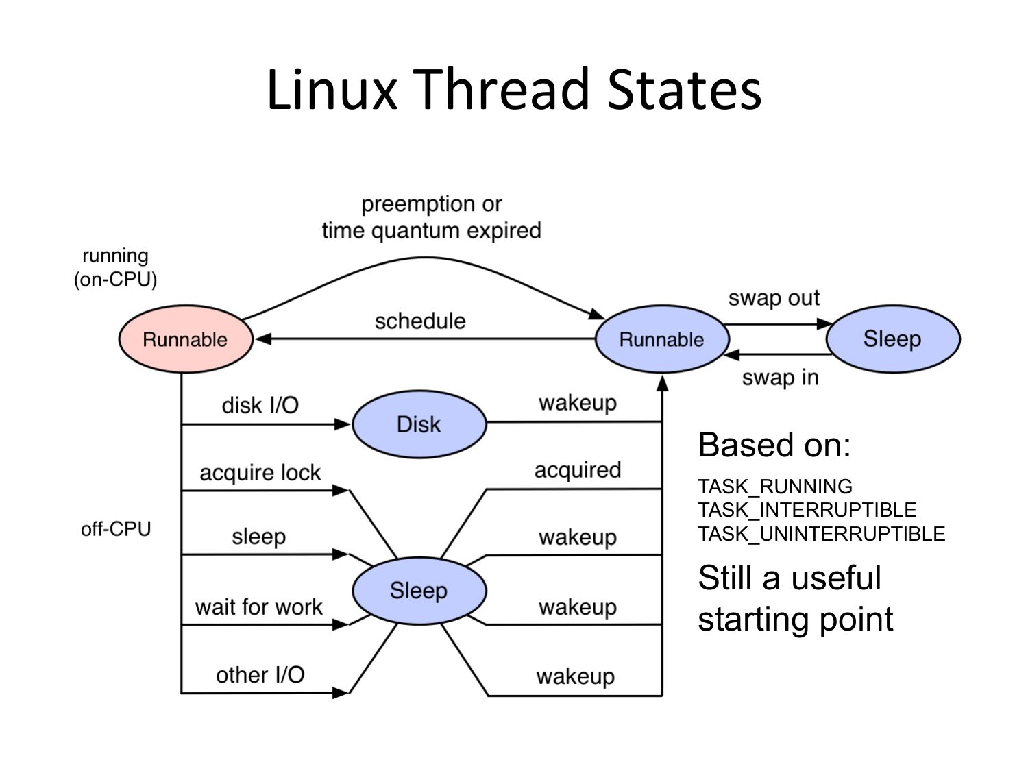 Linux Thread States Based on: TASK_RUNNING TASK_INTERRUPTIBLE TASK_UNINTERRUPTIBLE Still a useful starting pointslide 9: