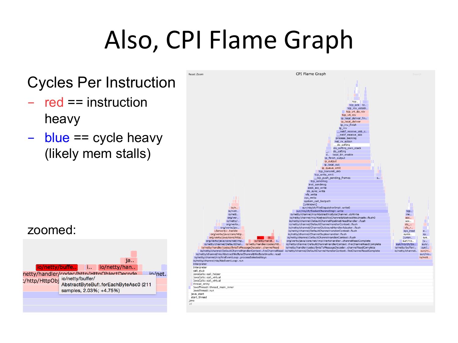 Also, CPI Flame Graph Cycles Per Instruction - red == instruction heavy - blue == cycle heavy (likely mem stalls) zoomed:slide 15: