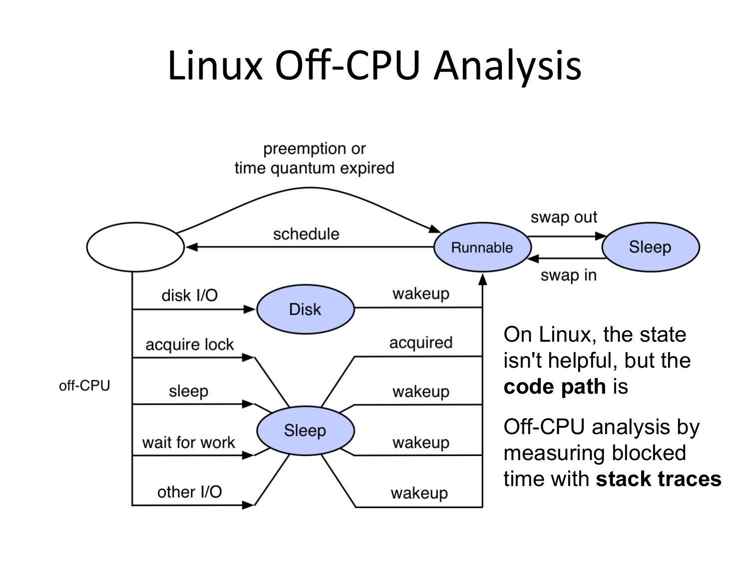 Linux Off-‐CPU Analysis On Linux, the state isn't helpful, but the code path is Off-CPU analysis by measuring blocked time with stack tracesslide 16:
