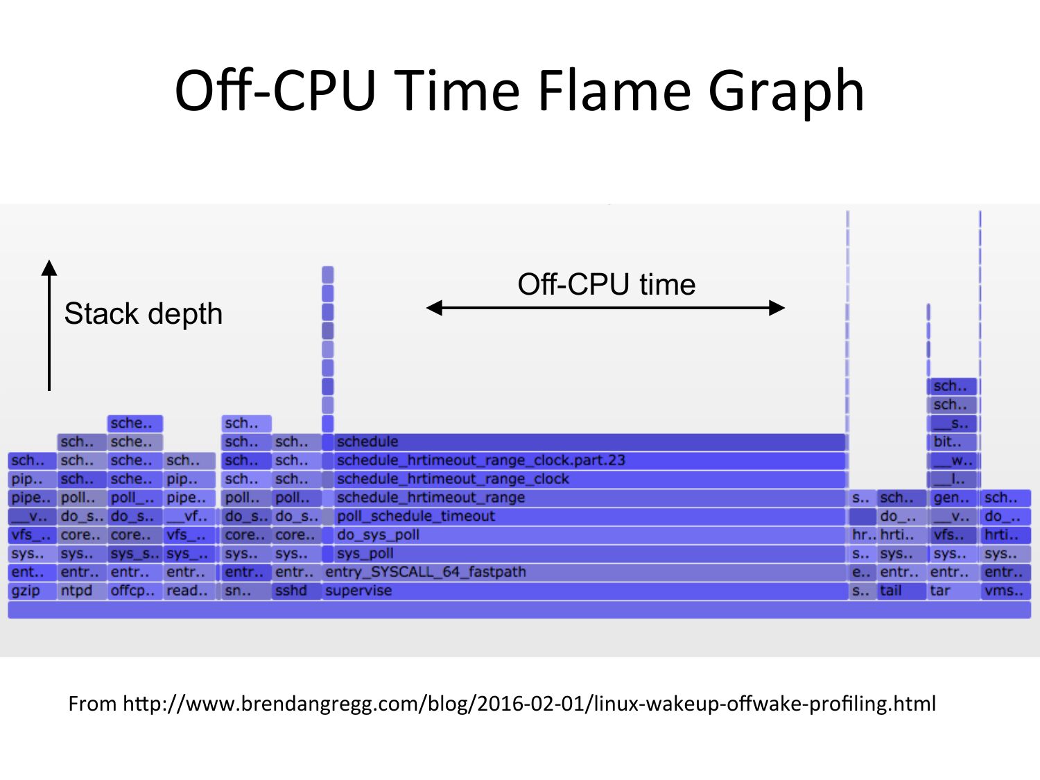 Off-‐CPU Time Flame Graph Stack depth Off-CPU time From hRp://www.brendangregg.com/blog/2016-‐02-‐01/linux-‐wakeup-‐offwake-‐profiling.htmlslide 17: