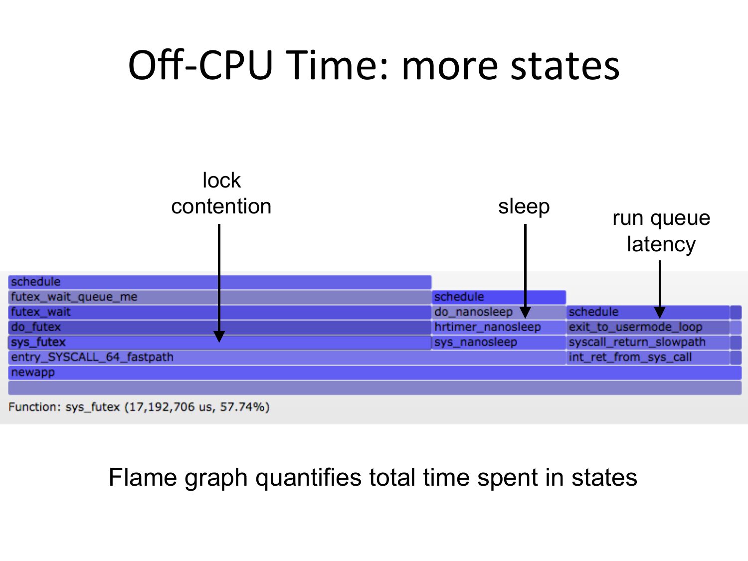Off-‐CPU Time: more states lock contention sleep run queue latency Flame graph quantifies total time spent in statesslide 19:
