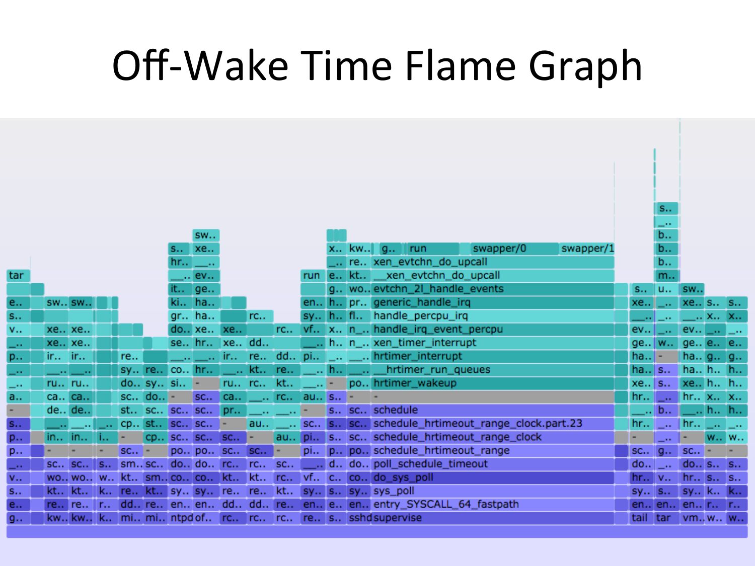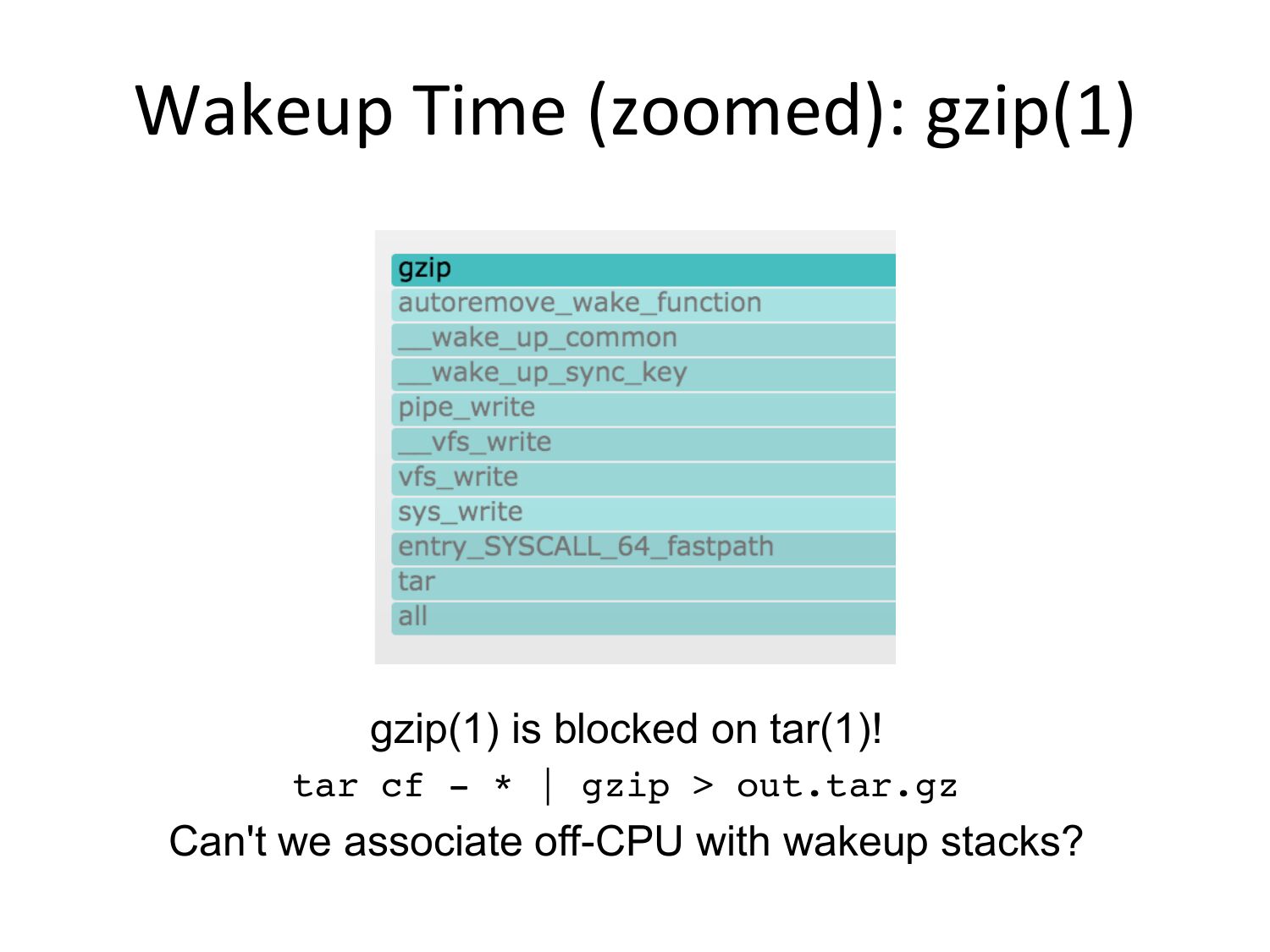 Wakeup Time (zoomed): gzip(1) gzip(1) is blocked on tar(1)! tar cf - * | gzip >gt; out.tar.gz Can't we associate off-CPU with wakeup stacks?slide 23: