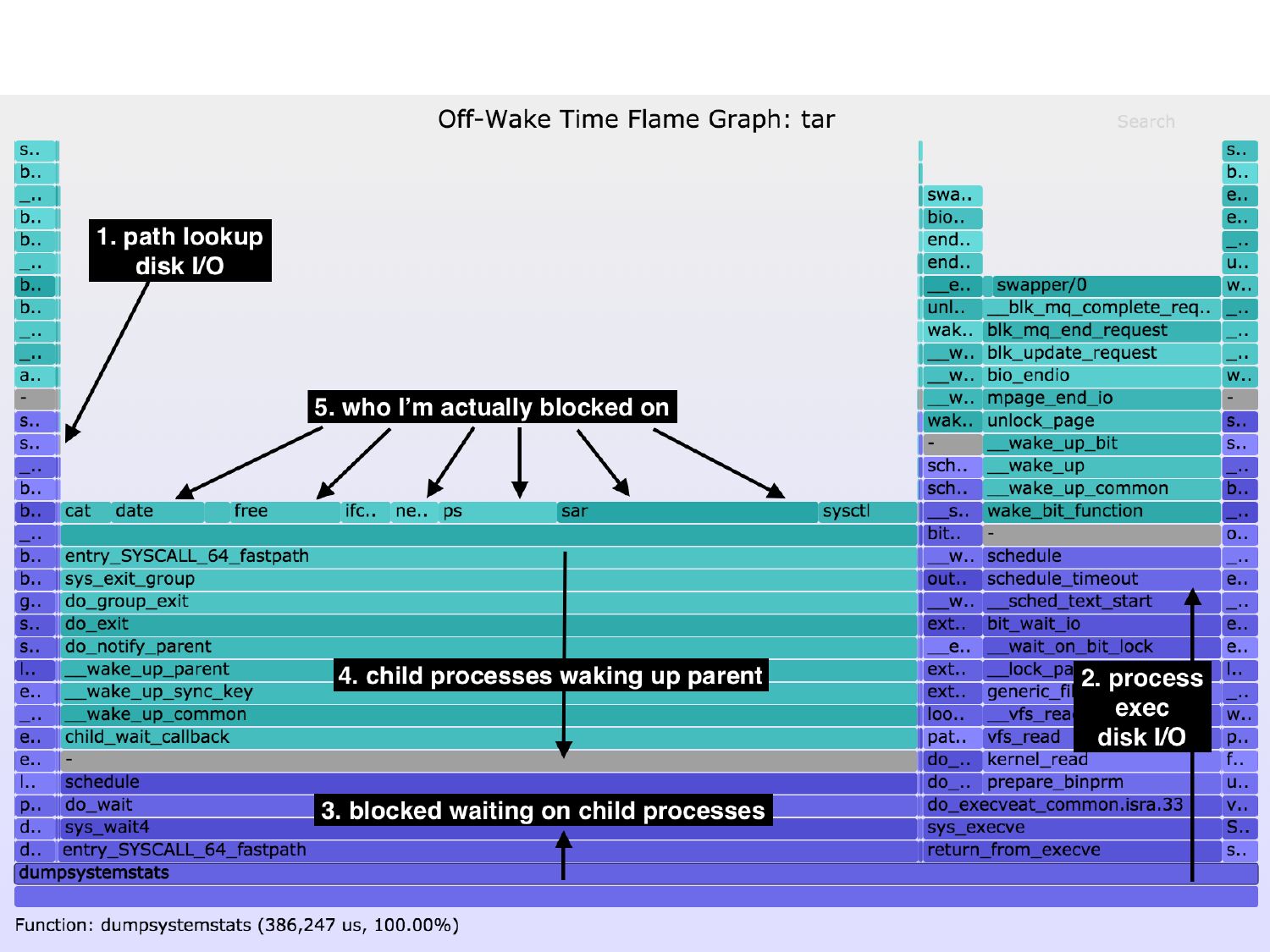 Off-‐CPU Time (zoomed): tar(1) directory read from disk file read from disk fstat from disk path read from disk pipe write Currently kernel stacks only; user stacks will add more contextslide 18: