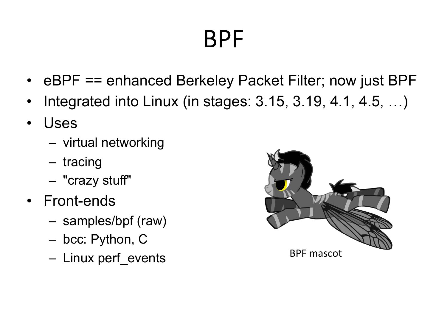 BPF • eBPF == enhanced Berkeley Packet Filter; now just BPF • Integrated into Linux (in stages: 3.15, 3.19, 4.1, 4.5, …) • Uses – virtual networking – tracing – "crazy stuff" • Front-ends – samples/bpf (raw) – bcc: Python, C – Linux perf_events BPF mascotslide 33: