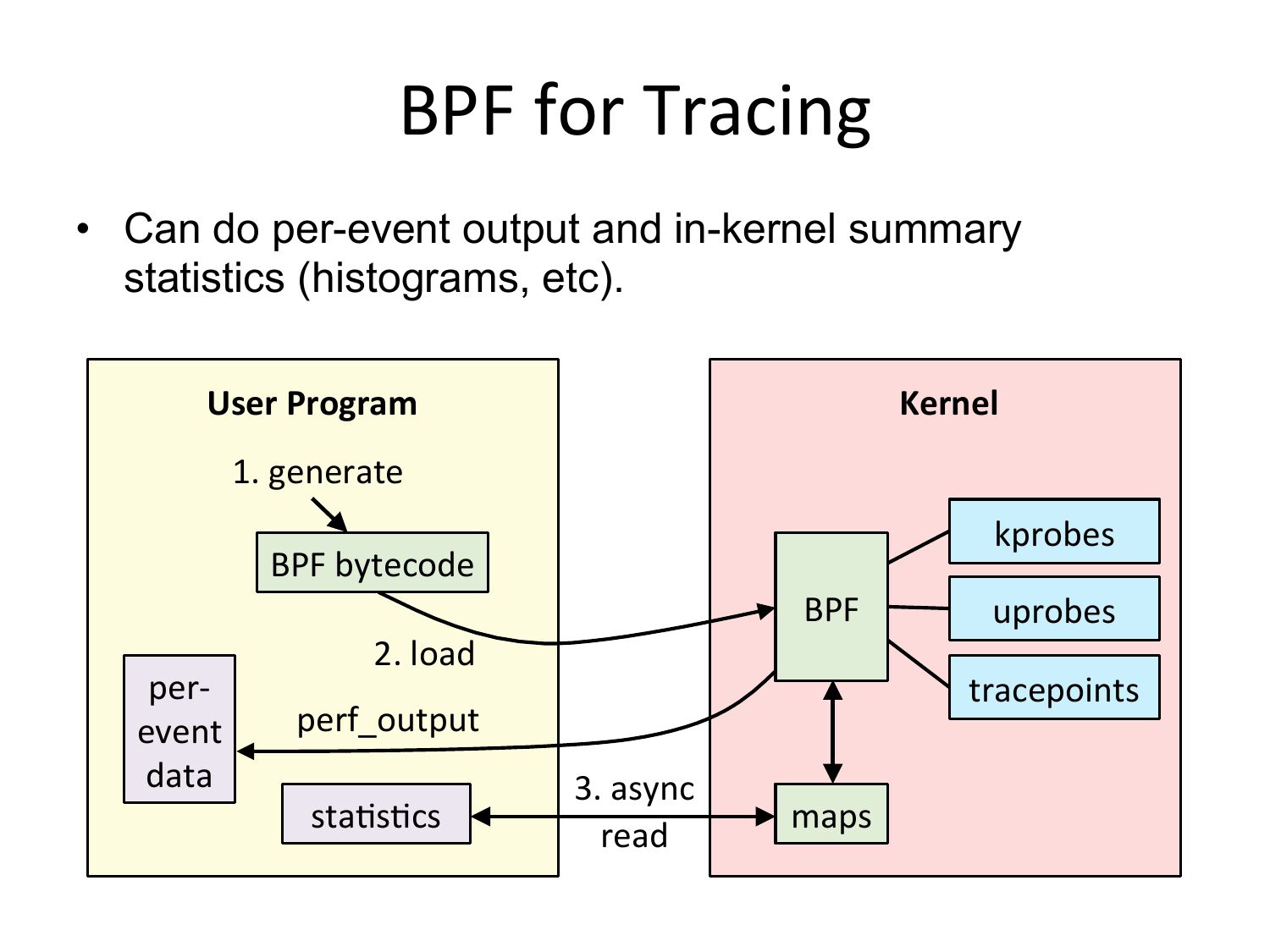 BPF for Tracing • Can do per-event output and in-kernel summary statistics (histograms, etc). User Program Kernel 1. generate kprobes BPF bytecode per-‐ event data BPF 2. load tracepoints perf_output stabsbcs uprobes 3. async read mapsslide 34: