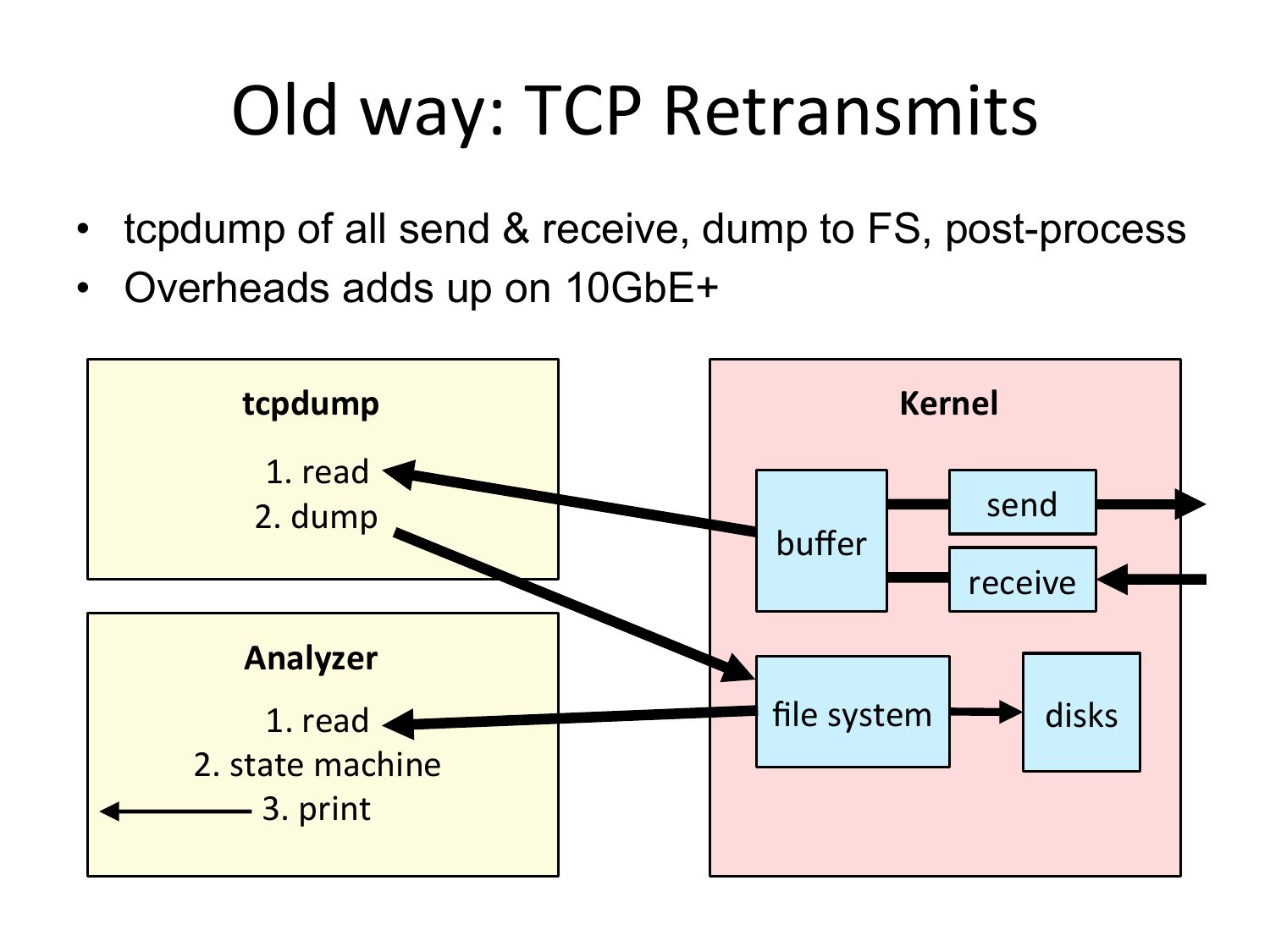 Old way: TCP Retransmits • tcpdump of all send & receive, dump to FS, post-process • Overheads adds up on 10GbE+ tcpdump 1. read 2. dump Kernel buffer send receive Analyzer 1. read 2. state machine 3. print file system disksslide 35: