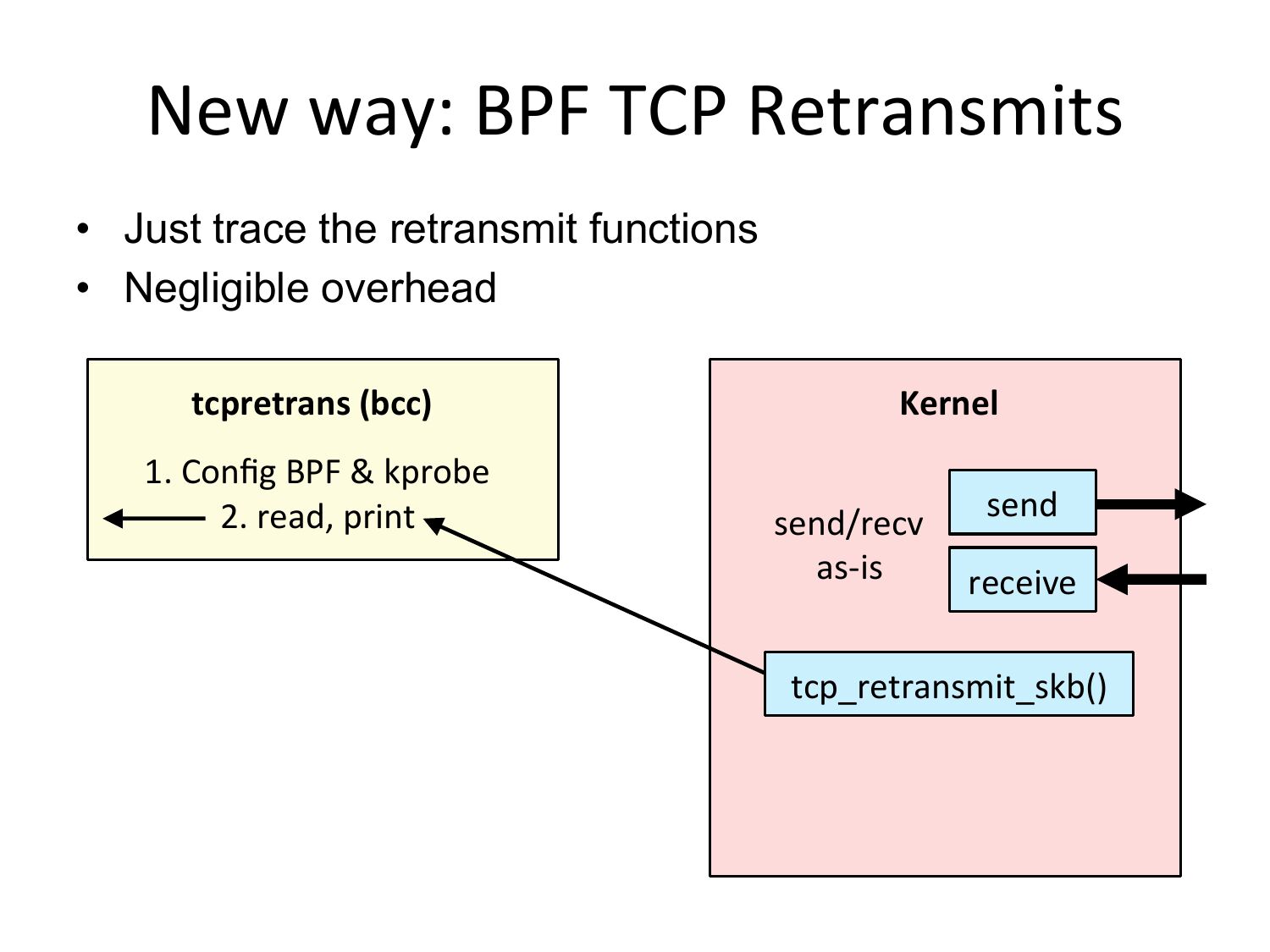 New way: BPF TCP Retransmits • Just trace the retransmit functions • Negligible overhead tcpretrans (bcc) 1. Config BPF & kprobe 2. read, print Kernel send/recv send as-‐is receive tcp_retransmit_skb()slide 36: