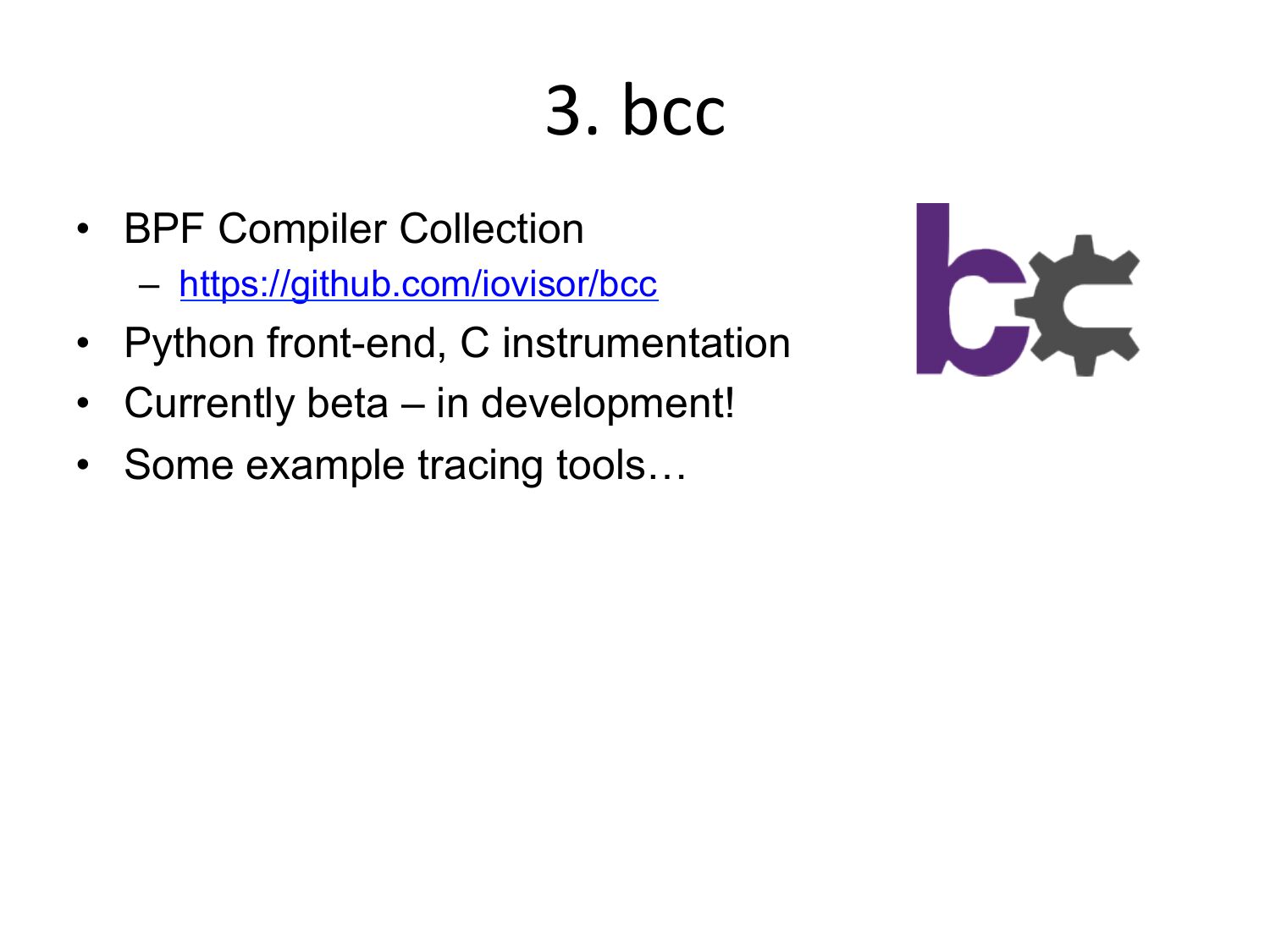 3. bcc • BPF Compiler Collection – https://github.com/iovisor/bcc • Python front-end, C instrumentation • Currently beta – in development! • Some example tracing tools…slide 44: