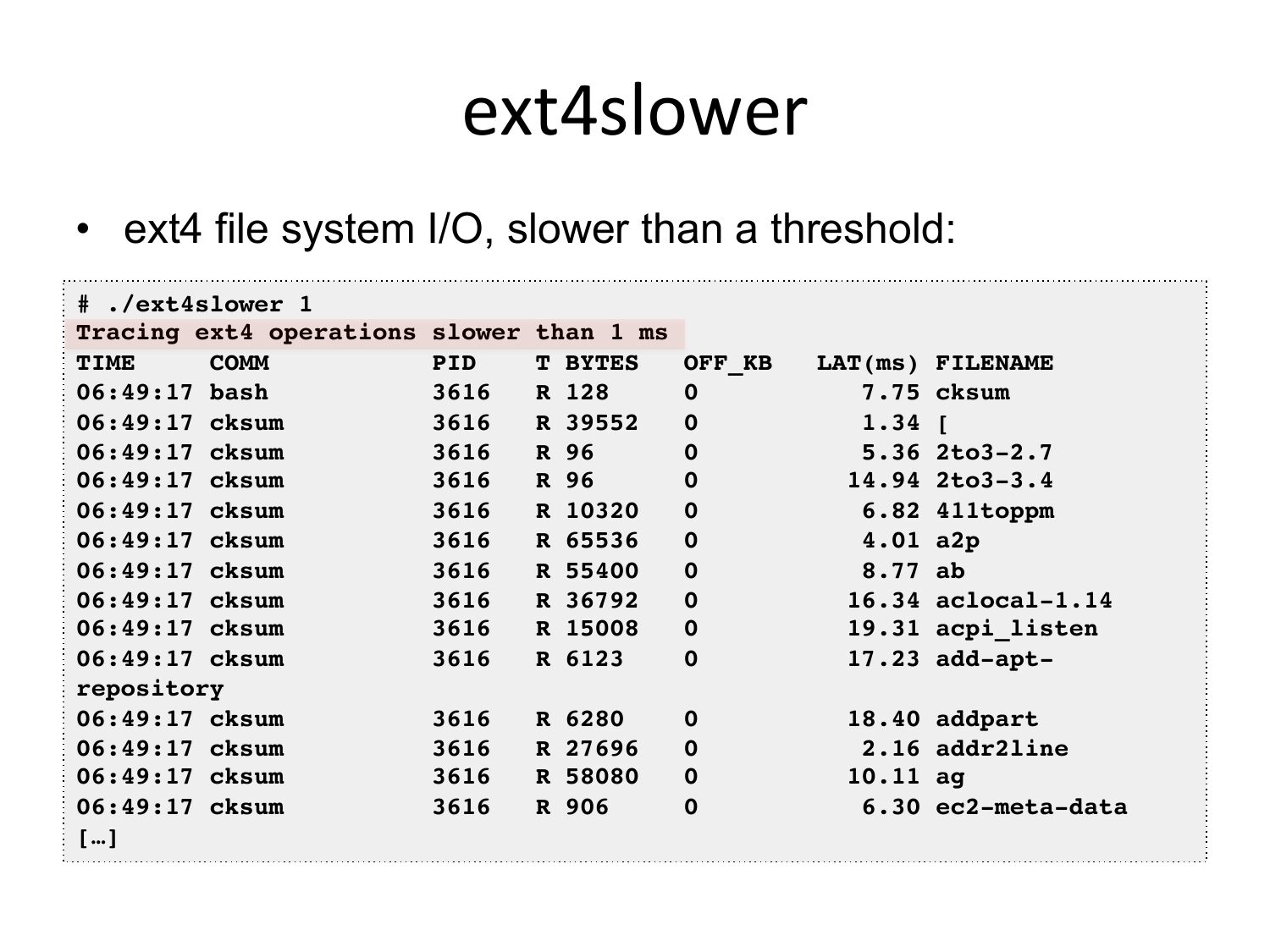 ext4slower • ext4 file system I/O, slower than a threshold: # ./ext4slower 1 Tracing ext4 operations slower than 1 ms TIME COMM PID T BYTES OFF_KB 06:49:17 bash R 128 06:49:17 cksum R 39552 06:49:17 cksum R 96 06:49:17 cksum R 96 06:49:17 cksum R 10320 06:49:17 cksum R 65536 06:49:17 cksum R 55400 06:49:17 cksum R 36792 06:49:17 cksum R 15008 06:49:17 cksum R 6123 repository 06:49:17 cksum R 6280 06:49:17 cksum R 27696 06:49:17 cksum R 58080 06:49:17 cksum R 906 […] LAT(ms) FILENAME 7.75 cksum 1.34 [ 5.36 2to3-2.7 14.94 2to3-3.4 6.82 411toppm 4.01 a2p 8.77 ab 16.34 aclocal-1.14 19.31 acpi_listen 17.23 add-apt18.40 addpart 2.16 addr2line 10.11 ag 6.30 ec2-meta-dataslide 47: