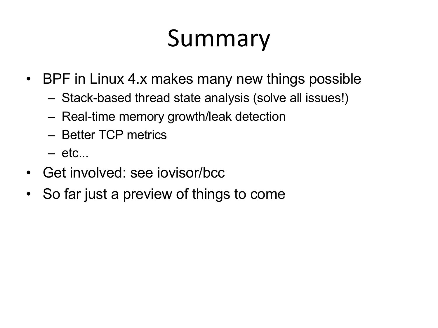 Summary • BPF in Linux 4.x makes many new things possible – Stack-based thread state analysis (solve all issues!) – Real-time memory growth/leak detection – Better TCP metrics – etc... • Get involved: see iovisor/bcc • So far just a preview of things to comeslide 59: