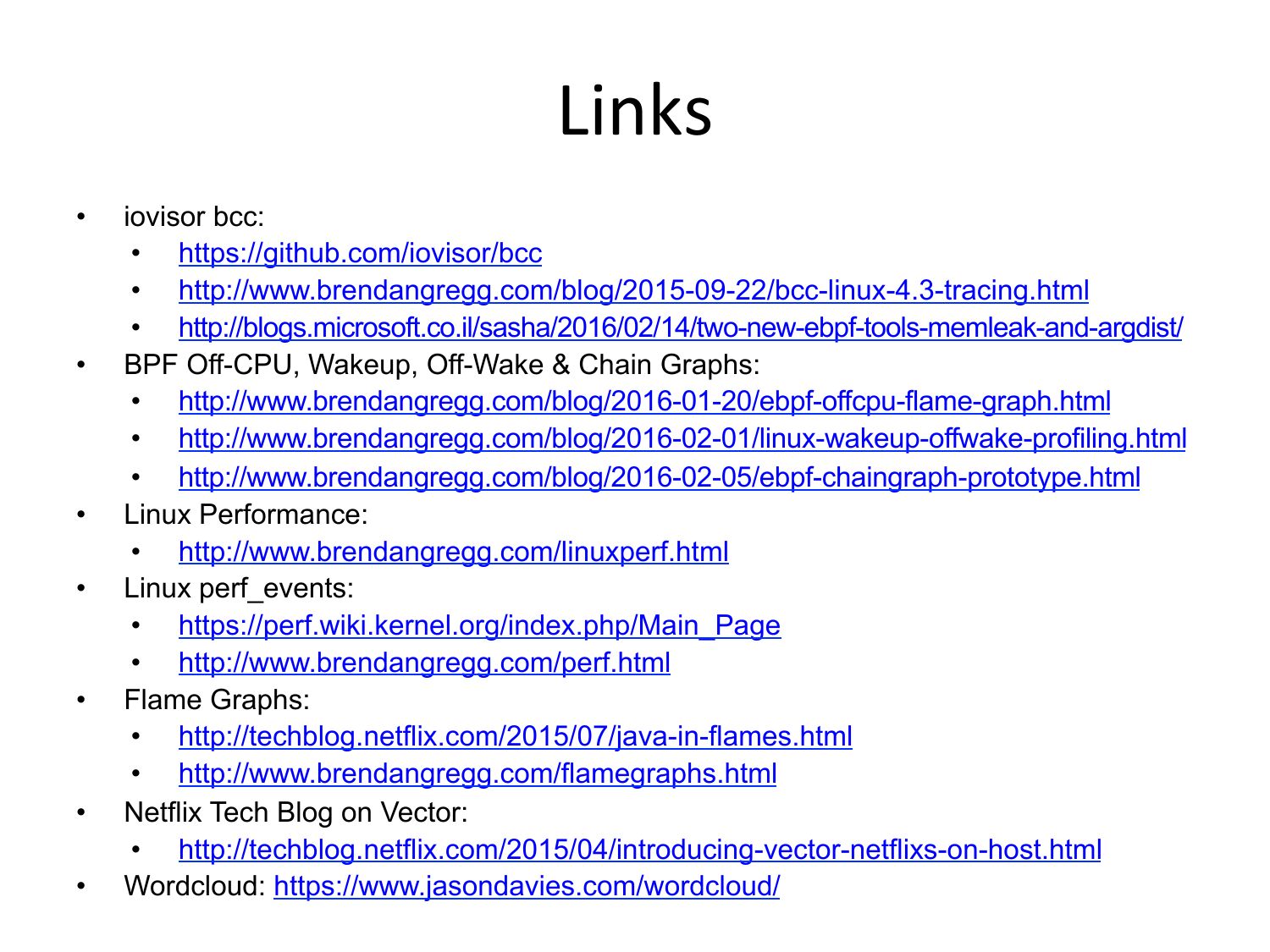 Links iovisor bcc: • https://github.com/iovisor/bcc • http://www.brendangregg.com/blog/2015-09-22/bcc-linux-4.3-tracing.html • http://blogs.microsoft.co.il/sasha/2016/02/14/two-new-ebpf-tools-memleak-and-argdist/ BPF Off-CPU, Wakeup, Off-Wake & Chain Graphs: • http://www.brendangregg.com/blog/2016-01-20/ebpf-offcpu-flame-graph.html • http://www.brendangregg.com/blog/2016-02-01/linux-wakeup-offwake-profiling.html • http://www.brendangregg.com/blog/2016-02-05/ebpf-chaingraph-prototype.html Linux Performance: • http://www.brendangregg.com/linuxperf.html Linux perf_events: • https://perf.wiki.kernel.org/index.php/Main_Page • http://www.brendangregg.com/perf.html Flame Graphs: • http://techblog.netflix.com/2015/07/java-in-flames.html • http://www.brendangregg.com/flamegraphs.html Netflix Tech Blog on Vector: • http://techblog.netflix.com/2015/04/introducing-vector-netflixs-on-host.html Wordcloud: https://www.jasondavies.com/wordcloud/slide 60: