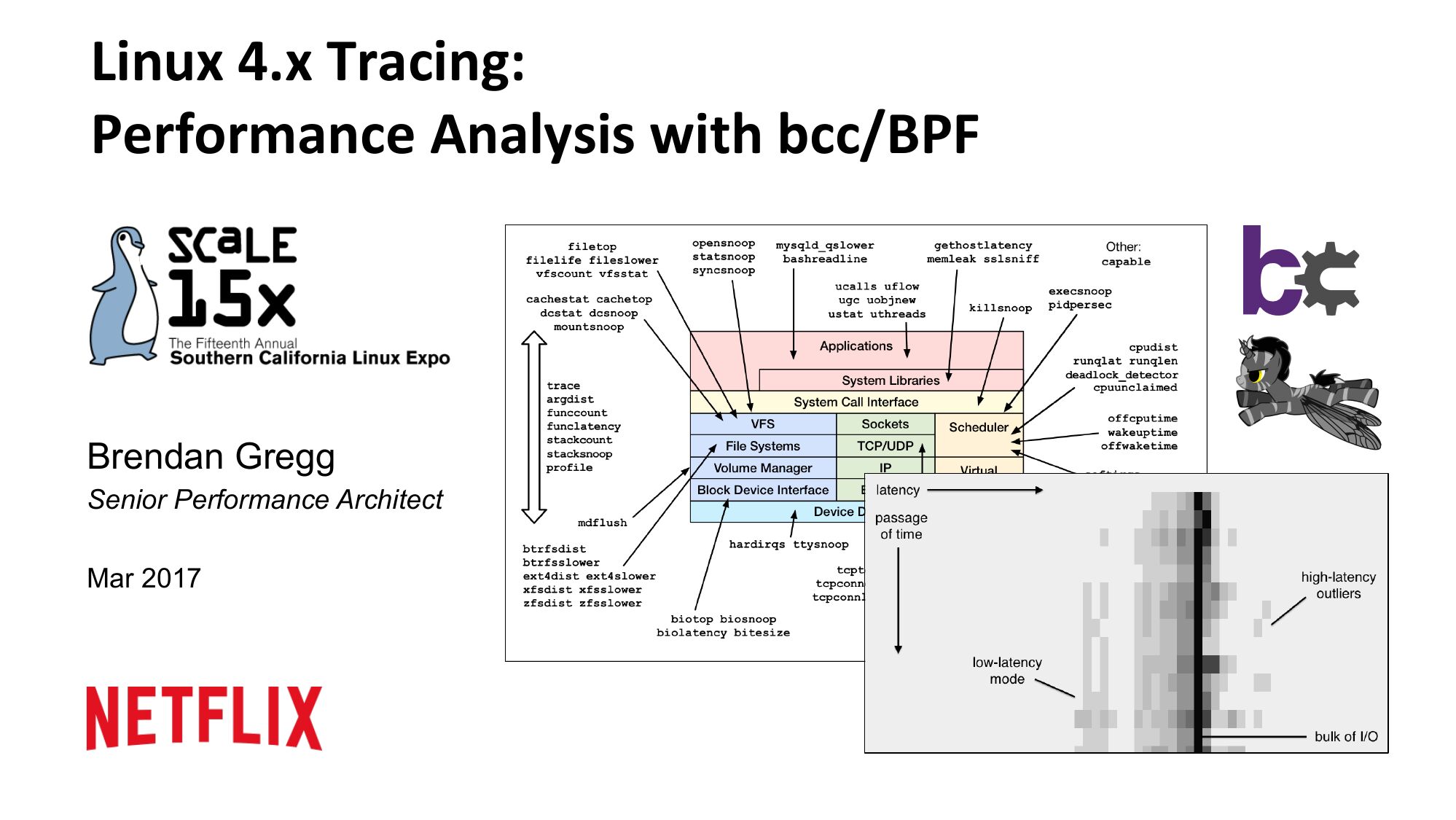 Description: "BPF (Berkeley Packet Filter) has been enhanced in the Linux 4.x series and now powers a large collection of performance analysis and observability tools ready for you to use, included in the bcc (BPF Complier Collection) open source project. BPF nowadays can do system tracing, software defined networks, and kernel fast path: much more than just filtering packets! This talk will focus on the bcc/BPF tools for performance analysis, which make use of other built in Linux capabilities: dynamic tracing (kprobes and uprobes) and static tracing (tracepoints and USDT). There are now bcc tools for measuring latency distributions for file system I/O and run queue latency, printing details of storage device I/O and TCP retransmits, investigating blocked stack traces and memory leaks, and a whole lot more. These lead to performance wins large and small, especially when instrumenting areas that previously had zero visibility. Tracing superpowers have finally arrived, built in to Linux."