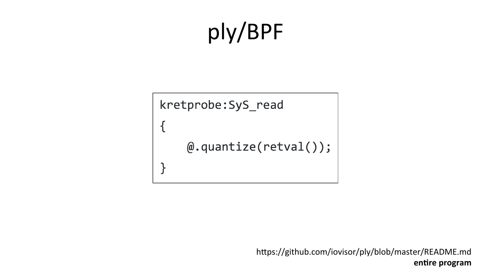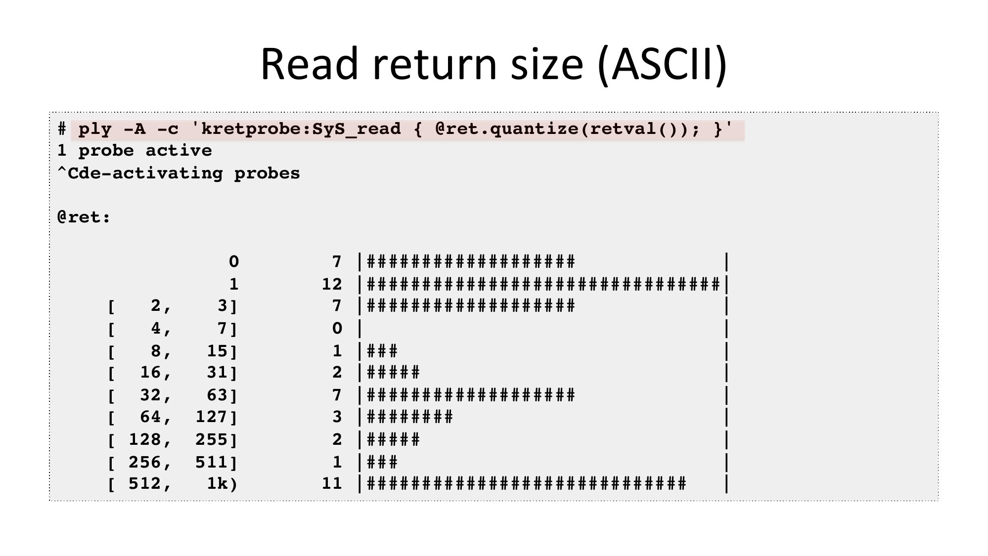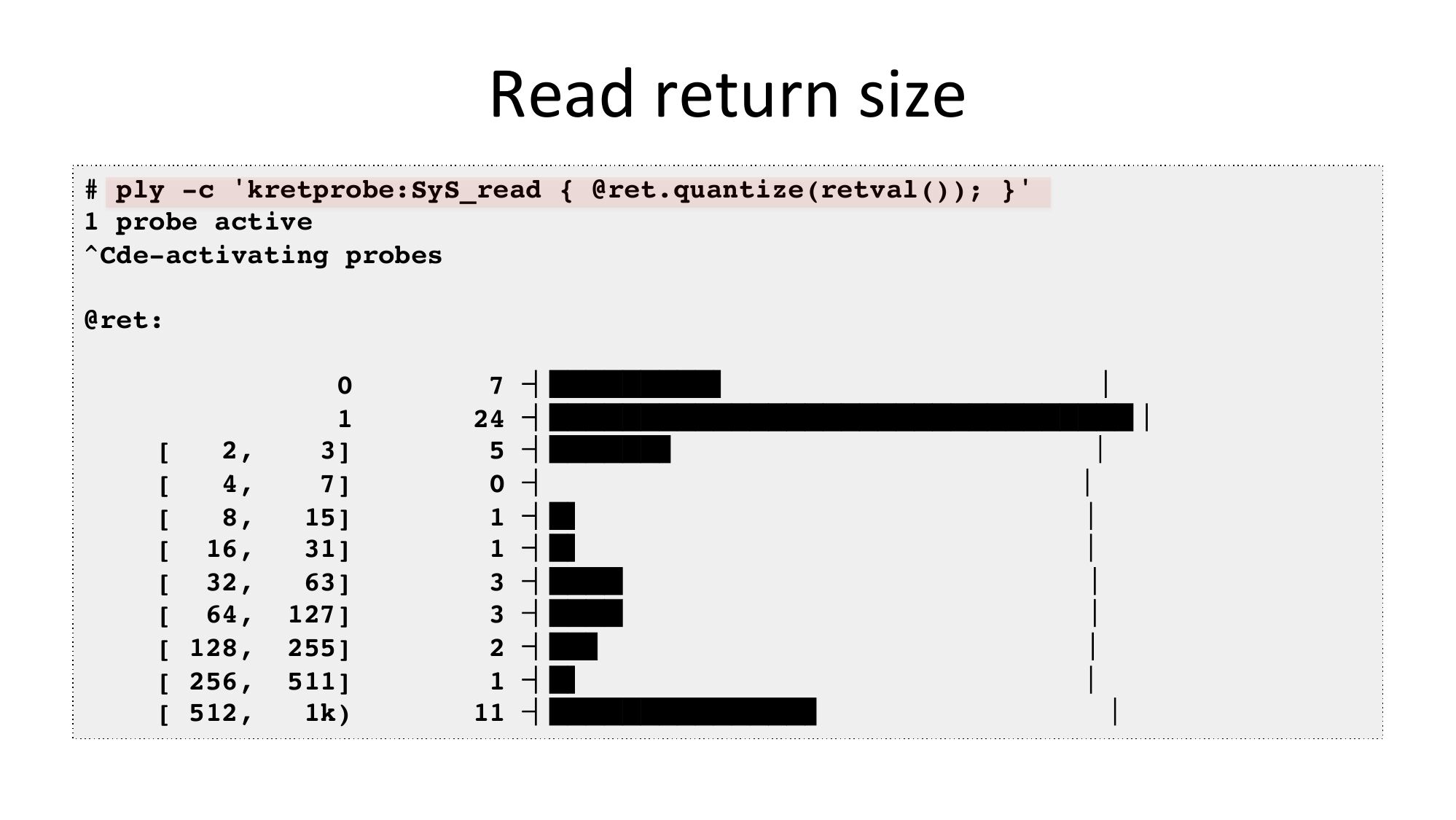 ply -c 'kretprobe:SyS_read { @ret.quantize(retval()); }'