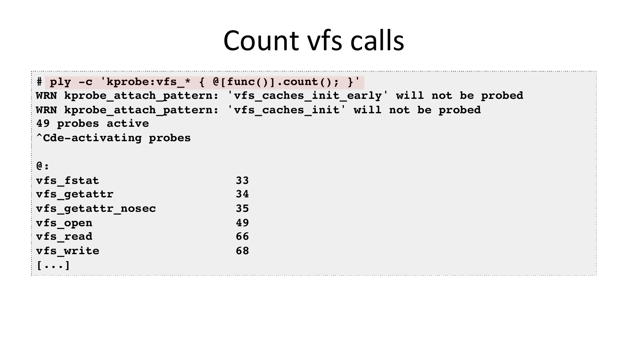 ply -c 'kprobe:vfs_* { @[comm(), func()].count(); }'