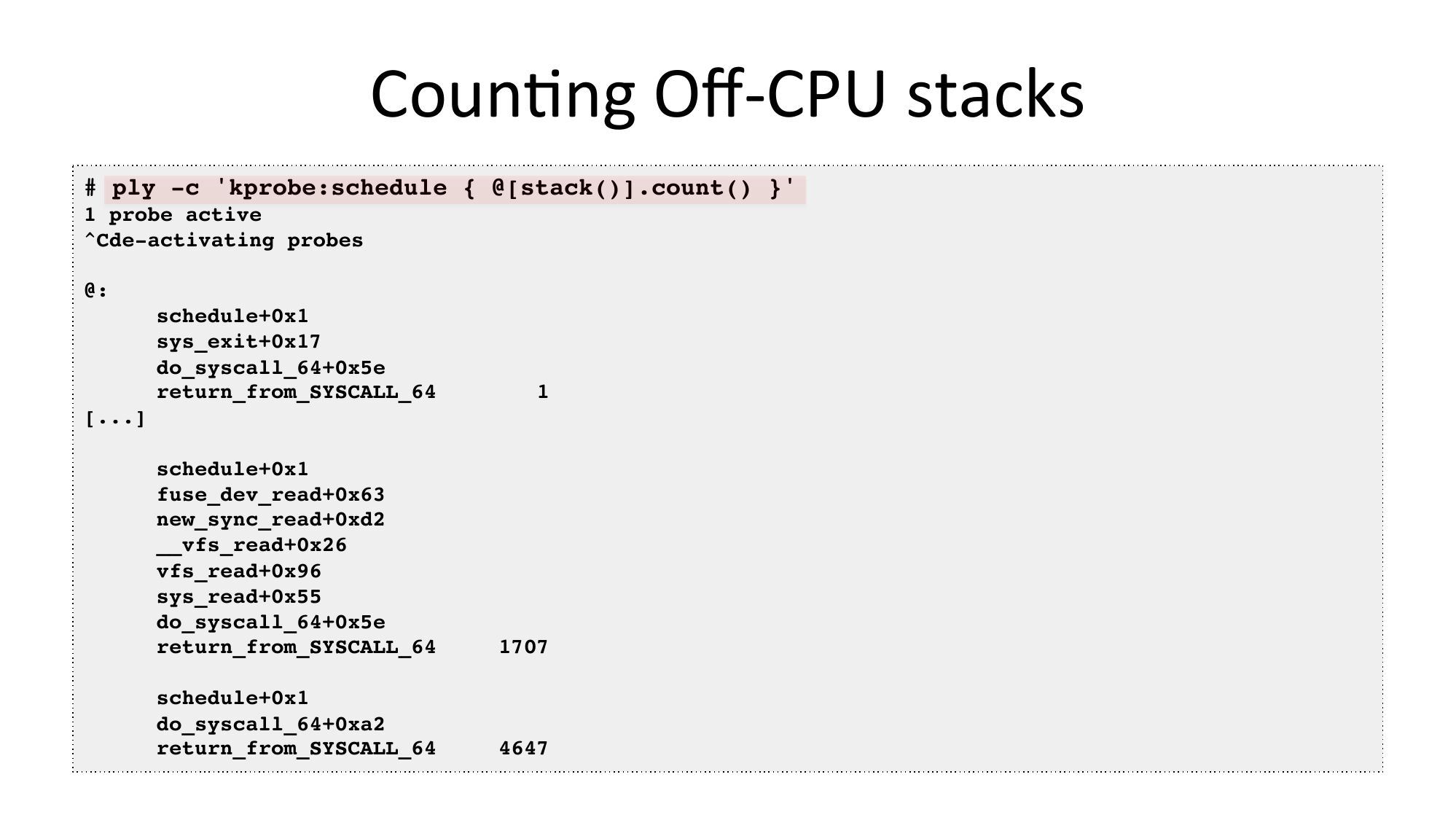ply -c 'kprobe:schedule { @[stack()].count() }'