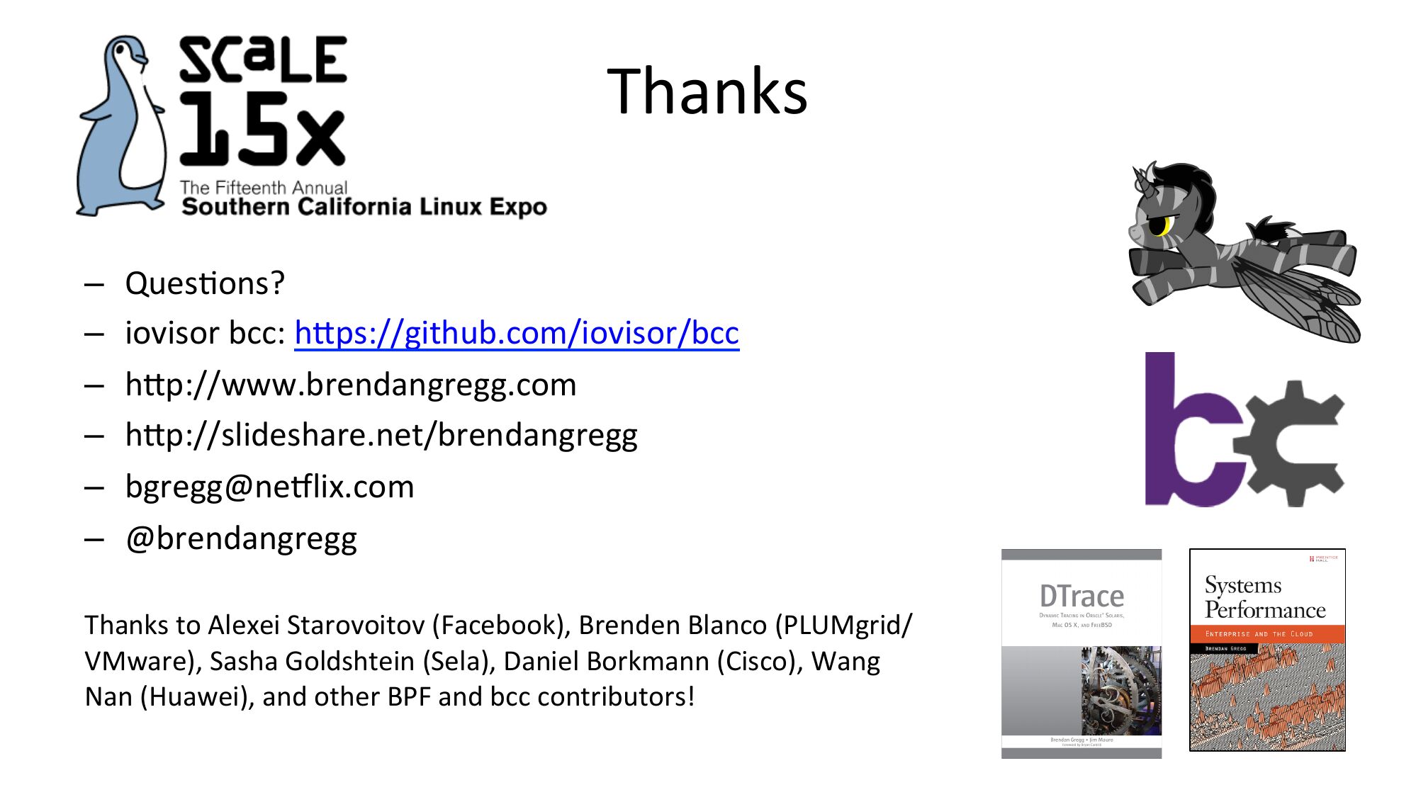 Talk about bcc/eBPF for Southern California Linux Expo 15x (2017) by Brendan Gregg.
