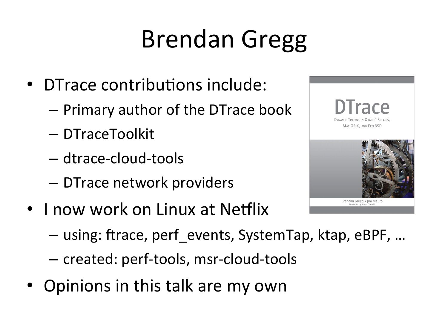 Description: "What can Linux learn from DTrace: what went well, and what didn't go well, on its path to success? This talk will discuss not just the DTrace software, but lessons from the marketing and adoption of a system tracer, and an inside look at how DTrace was really deployed and used in production environments. It will also cover ongoing problems with DTrace, and how Linux may surpass them and continue to advance the field of system tracing. A world expert and core contributor to DTrace, Brendan now works at Netflix on Linux performance with the various Linux tracers (ftrace, perf_events, eBPF, SystemTap, ktap, sysdig, LTTng, and the DTrace Linux ports), and will summarize his experiences and suggestions for improvements. He has also been contributing to various tracers: recently promoting ftrace and perf_events adoption through articles and front-end scripts, and testing eBPF."