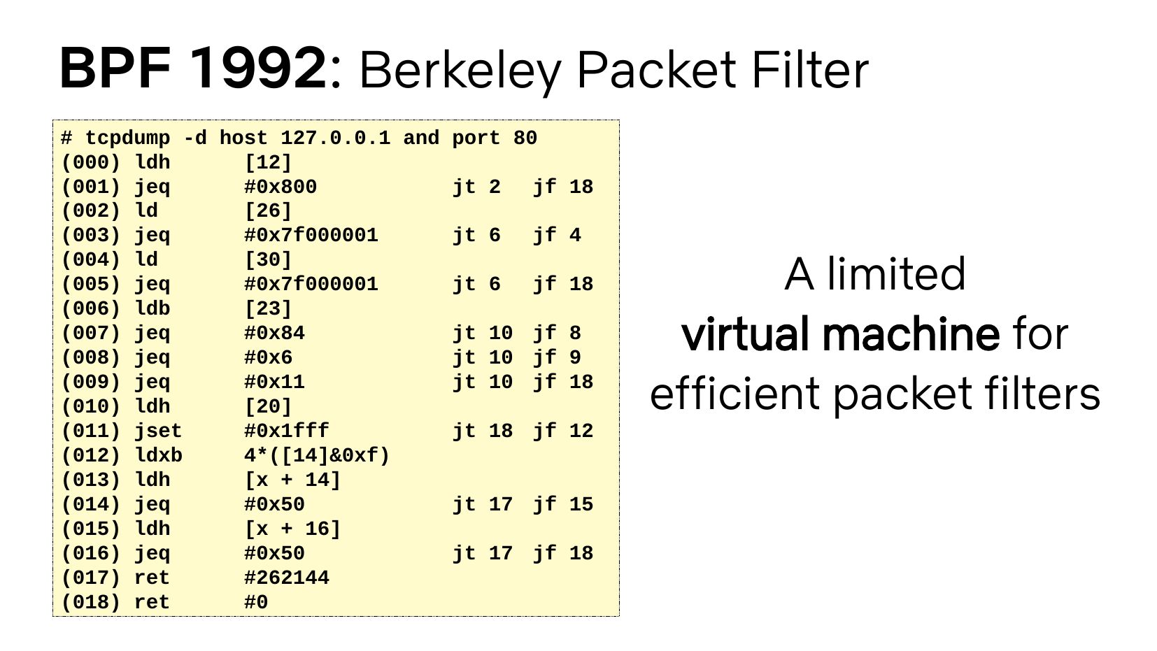 Description: "Extended BPF is a new type of software, and the first fundamental change to how kernels are used in 50 years. This new type of software is already in use by major companies: Netflix has 14 BPF programs running by default on all of its cloud servers, which run Ubuntu Linux. Facebook has 40 BPF programs running by default. Extended BPF is composed of an in-kernel runtime for executing a virtual BPF instruction set through a safety verifier and with JIT compilation. So far it has been used for software defined networking, performance tools, security policies, and device drivers, with more uses planned and more we have yet to think of. It is changing how we use and think about systems. This talk explores the past, present, and future of BPF, with BPF performance tools as a use case."